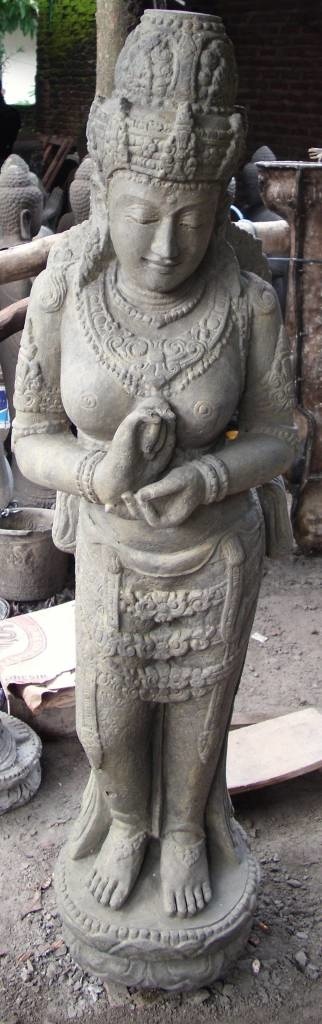 Standing Hindu goddess Dewi , 150cm with chakra hand mudra. Made of cast stone in black/brown color.