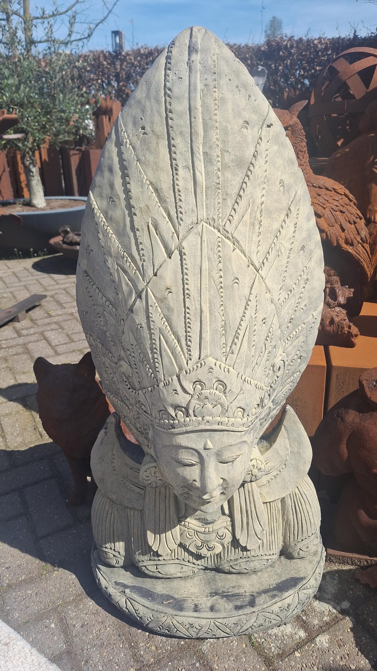 Are you looking for a beautiful oriental artwork for your garden or interior? This impressive statue of a Balinese goddess, measuring 106 centimeters in height, instantly brings a soothing and mystical atmosphere to your outdoor space. Expertly and painstakingly detailed, the statue depicts the goddess wearing a distinctive, high ornate headdress and striking, round earrings. Her soft facial expression with closed eyes radiates pure harmony and wisdom. Because the sculpture is made of sturdy material with a total weight of no less than 95 kilograms and a sturdy base size of 53 by 22 centimeters, you are assured of an extremely stable placement even during stormy weather. You will effortlessly create a luxurious oasis of tranquility in your own garden with it. Of course you are also always welcome in our spacious and inspiring showroom in Ammerzoden to come and admire this beautiful oriental sculpture and our many other sculptures at your leisure with your own eyes.