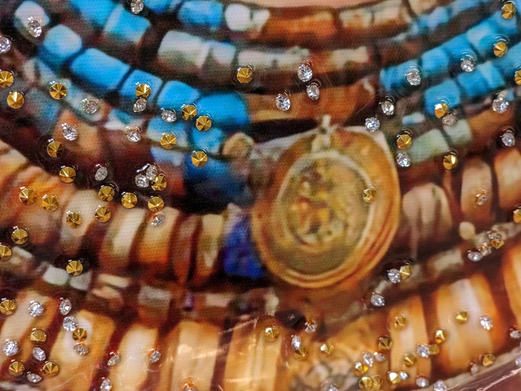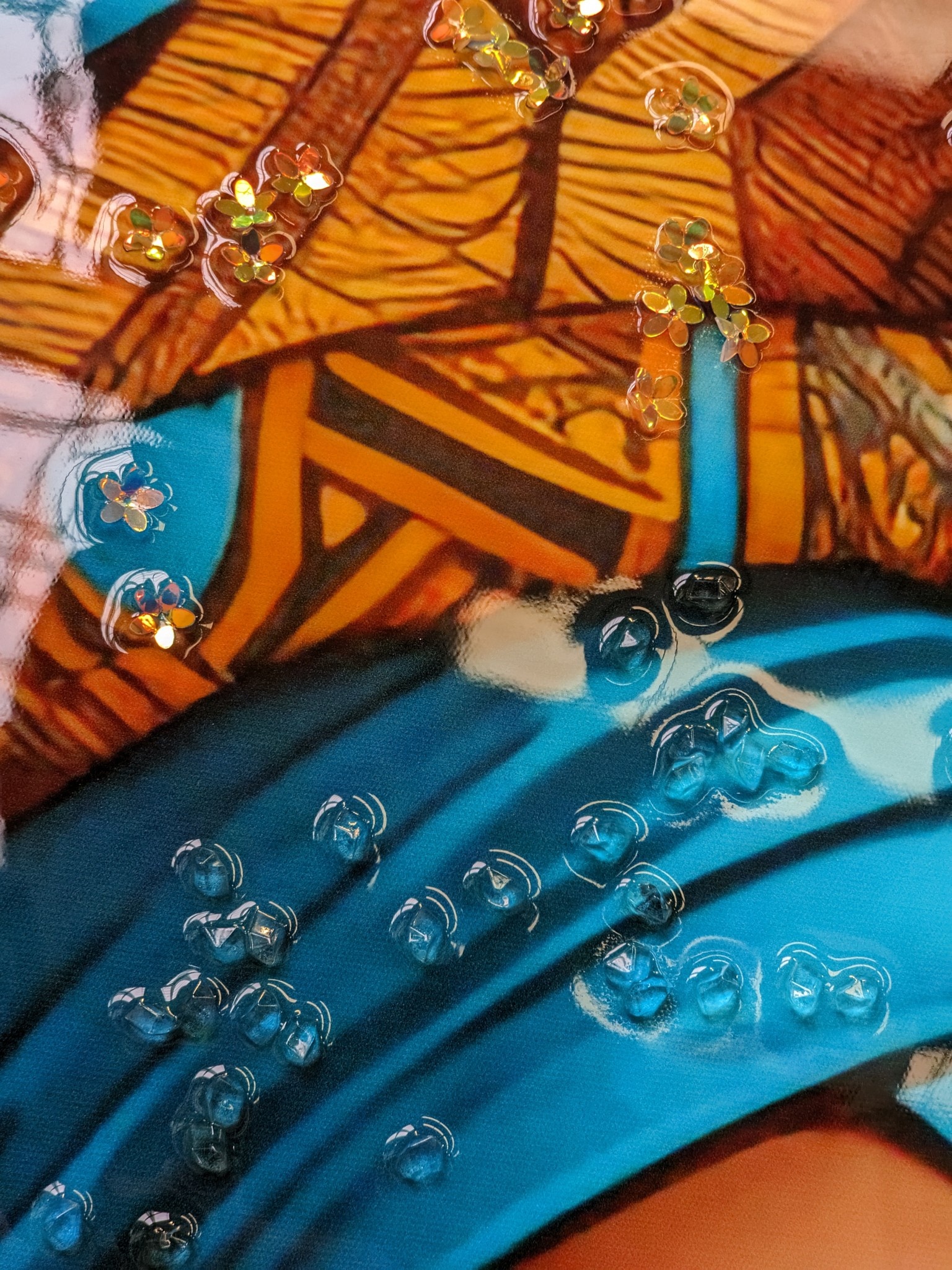 This canvas painting has undergone a very modern process during production. The canvas is printed, then all the stones are glued to the canvas. The painting is further finished with aqrylic paint.