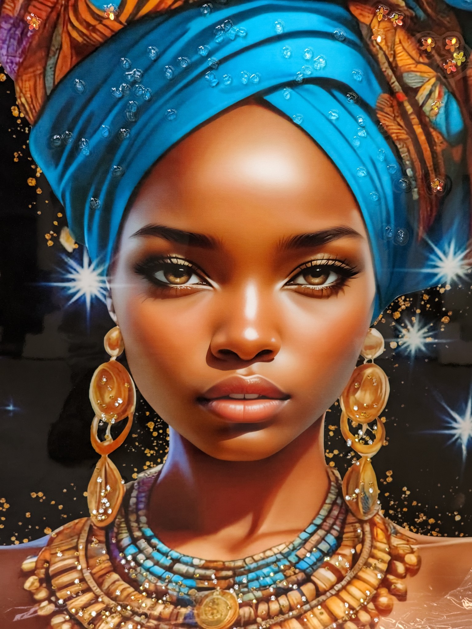 Are you looking for a hyper modern canvas painting with various rhinestone accents? Then this model painting with a beautiful lady on a dark background is definitely for you. This tall canvas painting has very nice accents with stones on the lady’s jewelry and headscarf, is carefully made with the most beautiful color compositions and with great attention to the finishing touches!