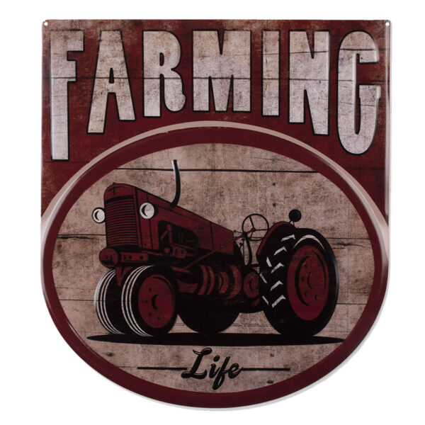 This wall deco is made of sheet metal, with a sprayed surface with a transfer over it and often a curled edge.