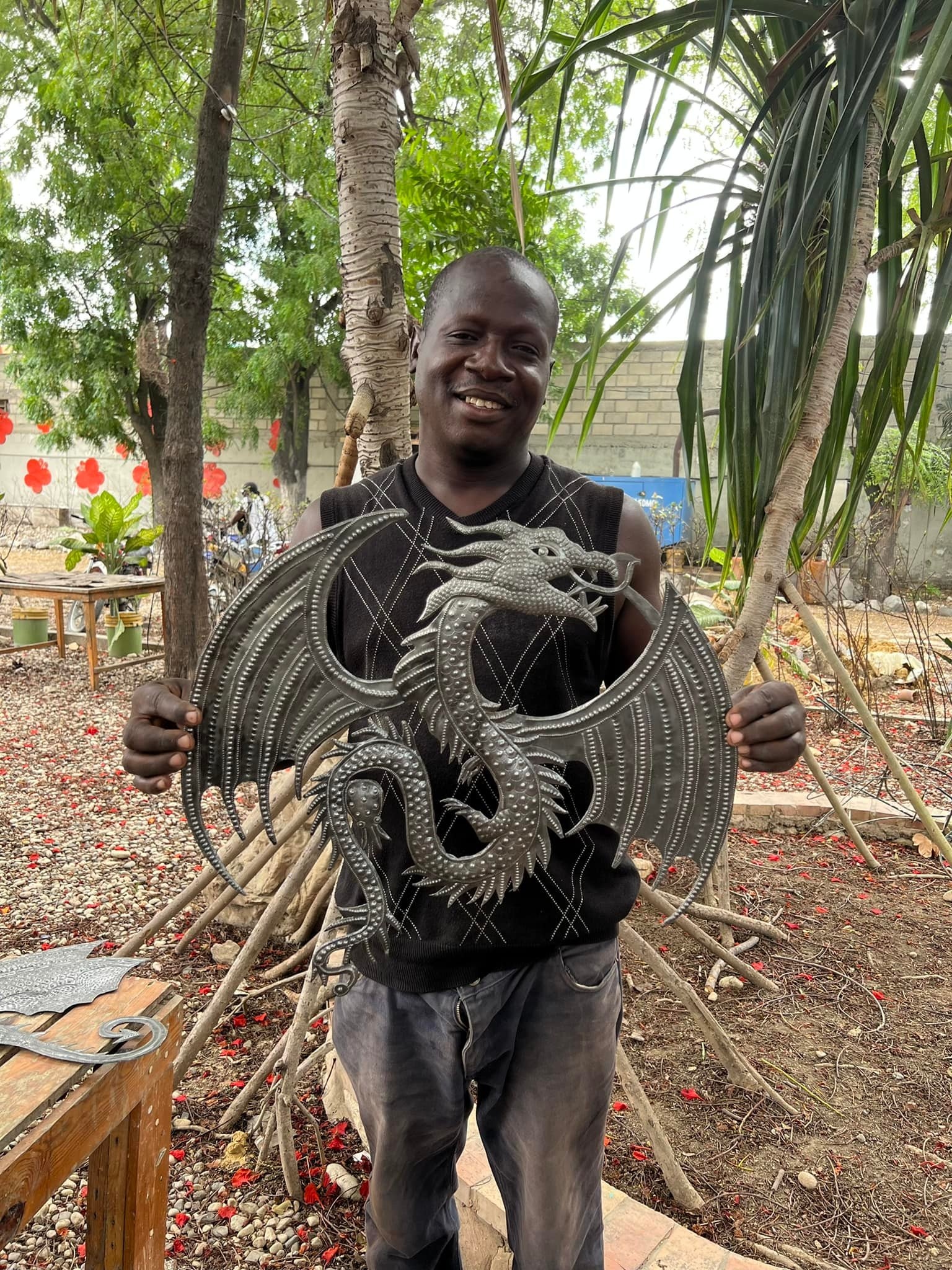 This piece of wall decoration is pleasing to the eye. This model wall deco of a dragon with spread wings was made in Haiti, by the so-called Forest Metal workers. This model wall decoration is made from the top of an oil drum, and with this, people spend days working to create this product. Cutting, bulging or flattening with hammer, working with dowel and painting. Looking closely at the article one is amazed at how much work must have been. When you order this item you are supporting the world store organizer Our Market and supporting these people in poverty-stricken Haiti.