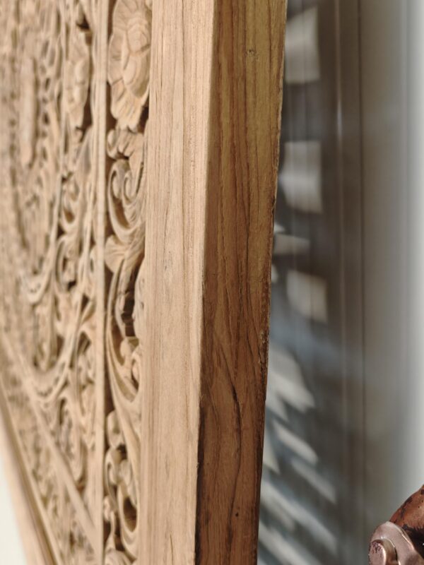 Wooden wall panel with an abstract figure. Handcrafted from teak wood. Pictured is a beautiful abstract drawing in a large square frame. Many many hours of carving work went into this wooden panel. Everything you see; every curl Beautiful and twigs, everything is made by human hands.