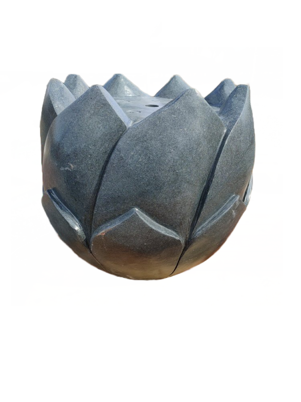 Water fountain flower made and developed in-house, not for sale anywhere else. Flower model, very labor intensive to make it. Made of polished basalt. Artistic object with a very small print run. Size is 50x50cm. Also looks very nice when placed in a pond or in a modern pond container.