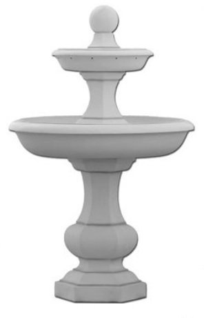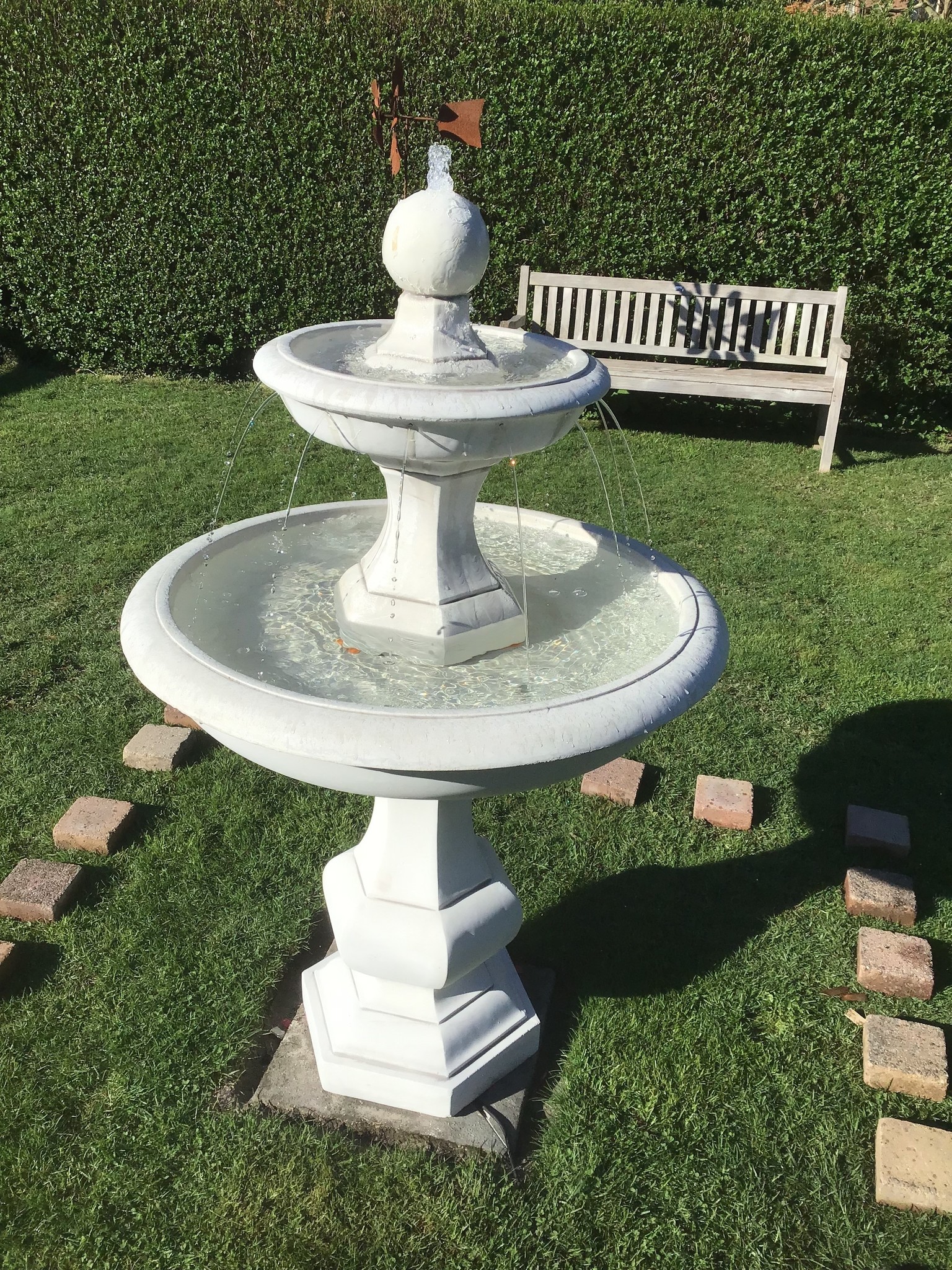 Zeer strakke witte fontein, 160cm hoog en 100cm diameter.