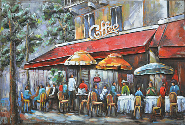 Mooi wordt uw huis of bedrijf met dit stuk muurdecoratie geheel met de hand gemaakt. Een zeer arbeidsintensief stuk wanddecoratie met elk een uniek karakter. Dit model metaalschilderij met een gezellig terras met koffie in een stad is helemaal met de hand gemaakt. Alles van dit wandobject is van metaal, zowel achtergrond en figuur dus. Omdat het handgeschilderd en gemaakt is, kan de kleur iets afwijken van de foto, 3D schilderijen zijn nooit precies hetzelfde. Op deze een beetje ruig gemaakte schilderijen kunnen altijd nog verder kleine afwijking zitten. Soms is dat zelfs bewust gedaan om de handbeschilderde sfeer te bewerkstelliggen.