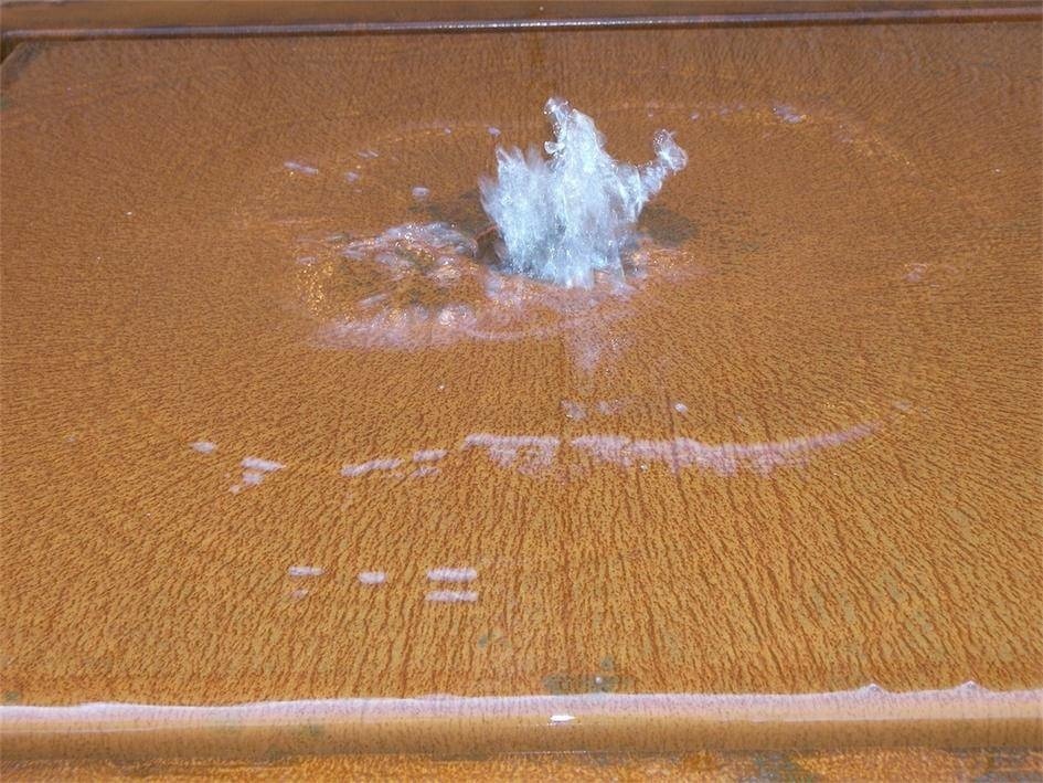 Zeer mooie ambachtelijk gemaakte en degelijk afgewerkte watertafel van 3mm dik cortenstaal. Op de bovenkant vormt het water een 2cm dikke waterlaag, welke subtiel van de randen afstroomt. Er kunnen eventueel ook steentjes op het plateau gestrooid worden als men dat wenst.