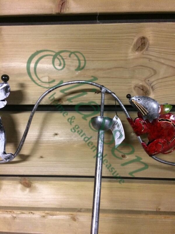 Schitterend afgewerkste metalen balans met kat, muis en hond die u overal in de tuin kunt steken. Deze zal bewegen en ronddraaien in de wind. Een sieraad in de tuin en mooi om kado te doen. Helemaal met de hand gemaakt en geverfd.