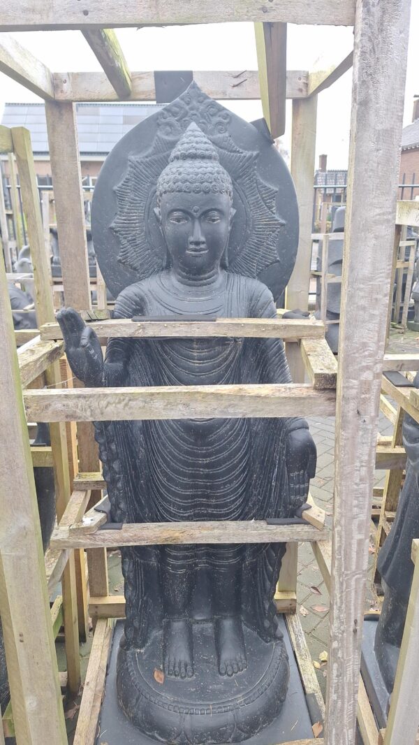 Uw huis of tuin krijgt een geheel eigen stijl met dit beeld van een Boeddha met aura achter het hoofd. Gemaakt van hoge kwaliteit gietsteen in een zwarte kleur met een bruinige inwassing.