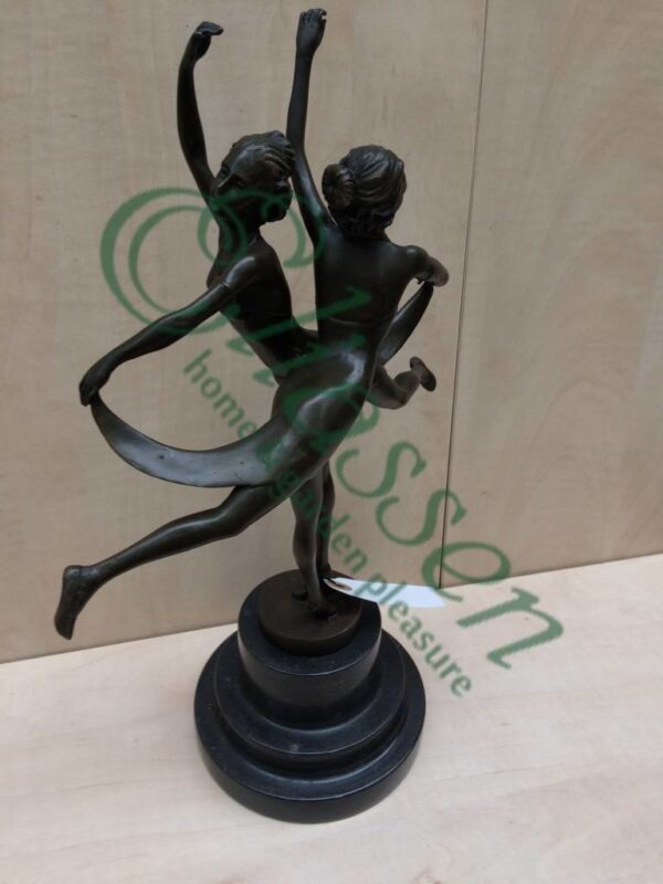 Mooi beeld van 2 danseressen , op marmeren voet, van 100% hoogwaardig brons met een minimale kopergehalte van 75% waardoor een zeer lange levensduur gegarandeerd is en geen lelijke vlekken ontstaan. Een prachtig en duurzaam decoratie object voor huis , bedrijf of tuin, maar ook voor een prachti geschenk. Zoekt een een bronzen beeld voor een jubilaris? Wij kunnen ook tekstplaatjes voor op de sokkel voor u verzorgen.