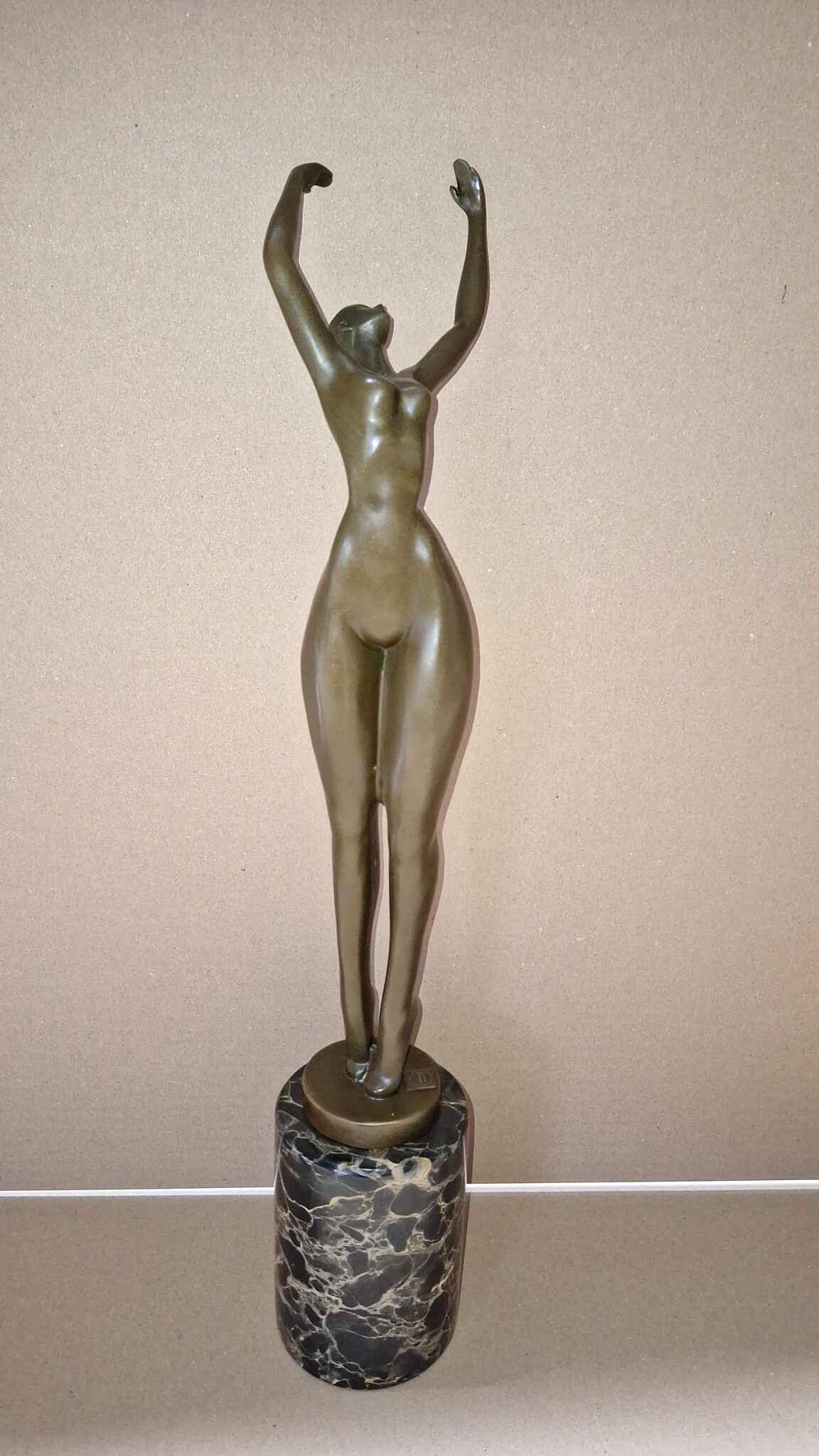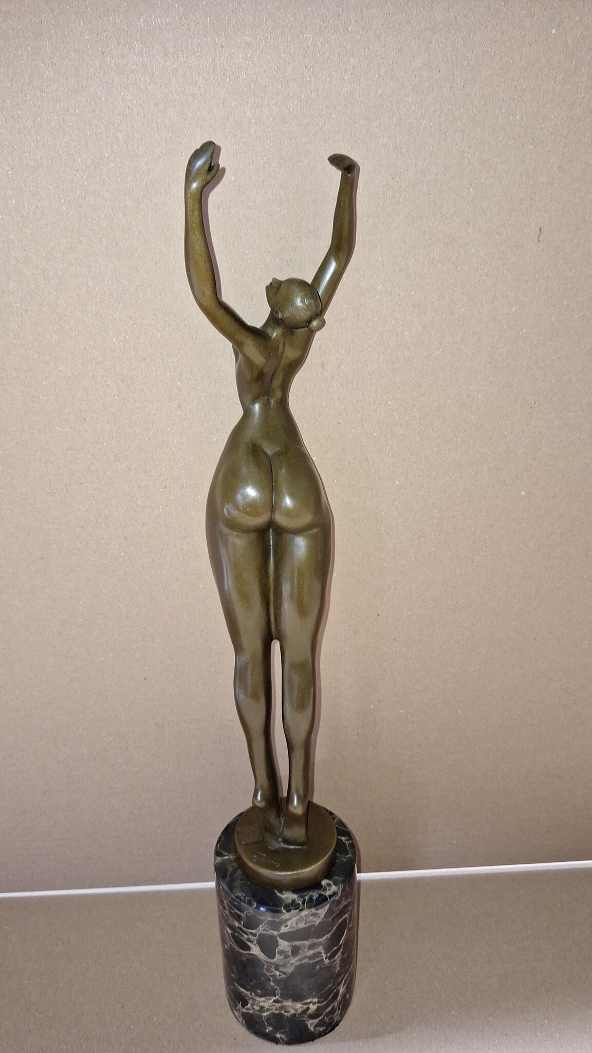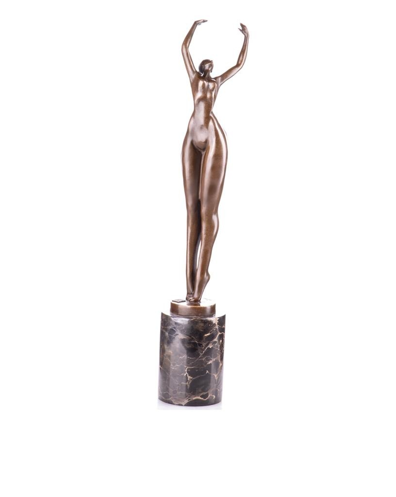 Dit bronzen moderne beeld van een dikke naakte vrouw met armen omhoog op een marmeren sokkel heeft de maat 8x47cm en is op ambachtelijke wijze gemaakt met de zogenoemde verlorenwas methode.