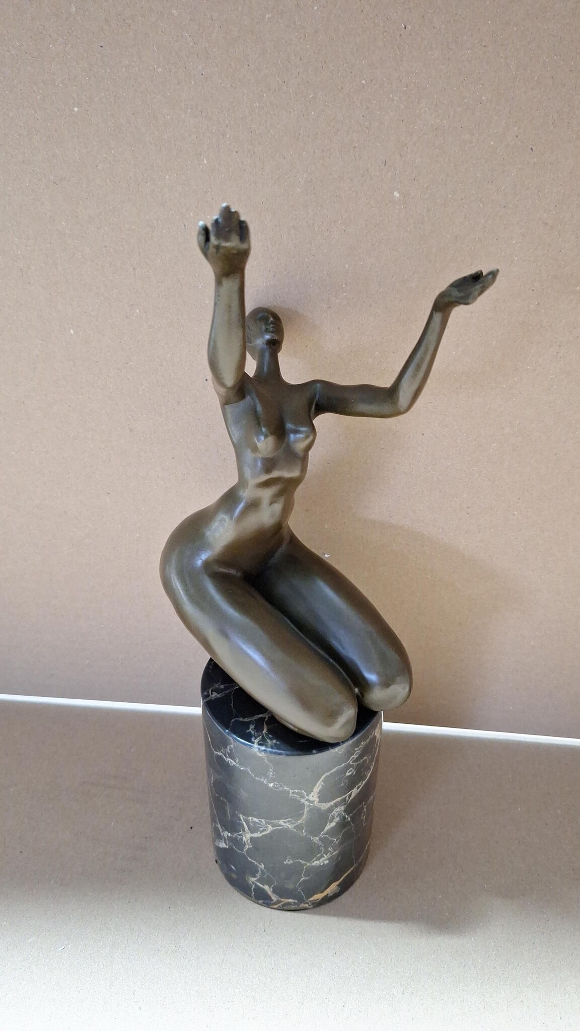 Beeld brons dikke naakte vrouw op knieen omhoogreikend op sokkel 32cm