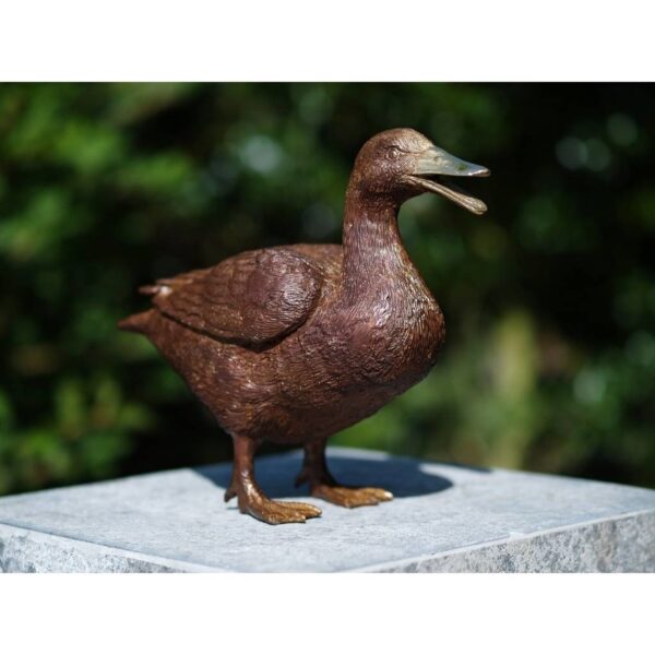 Mooi beeld van een eend van hoogwaardig brons met een minimale kopergehalte van 75% waardoor een zeer lange levensduur gegarandeerd is.