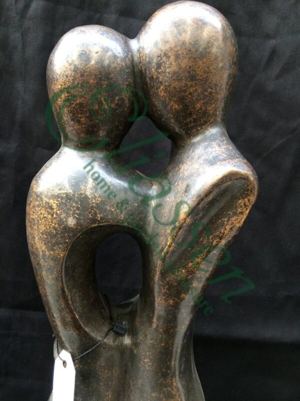 Mooi beeld van een groot abstract liefdespaar van hoogwaardig brons met een minimale kopergehalte van 75% waardoor een zeer lange levensduur gegarandeerd is.