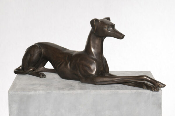 Dit bronzen klassieke beeld van een liggende hazenwind hond heeft de maat ca. 90x11x95cm hoog en is op ambachtelijke wijze gemaakt met de zogenoemde verlorenwas methode.