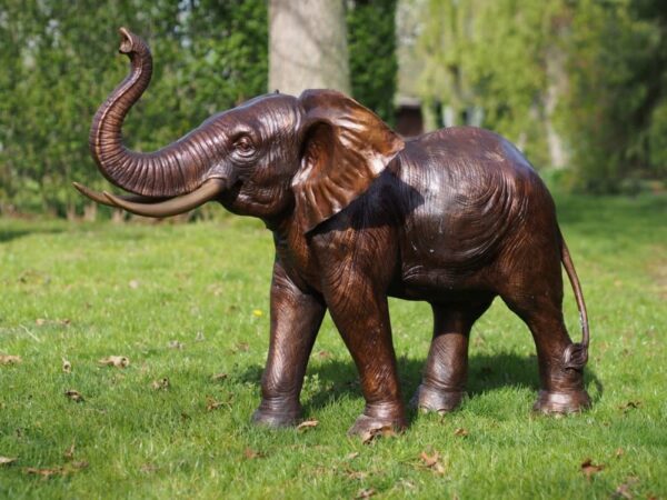 Mooi beeld van een grote baby olifant van echt brons. Het brons van dit beeld heeft een gegarandeerde kopergehalte van 75%, wat de levensduur en uitstraling zeer ten goede komt.