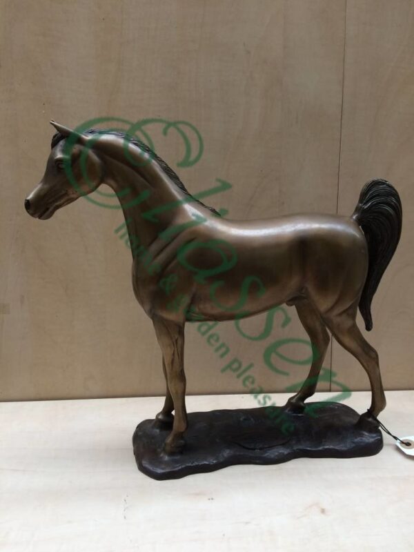 Mooi beeld van een paardje met gedragen staart van hoogwaardig brons met een minimale kopergehalte van 75% waardoor een zeer lange levensduur gegarandeerd is.