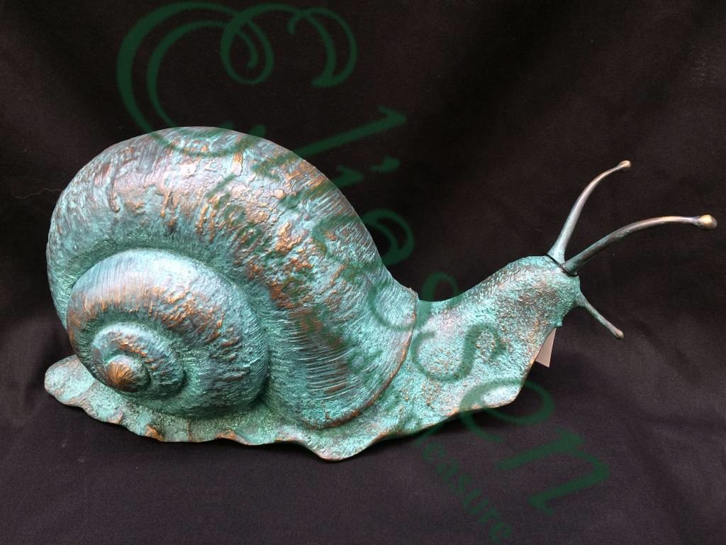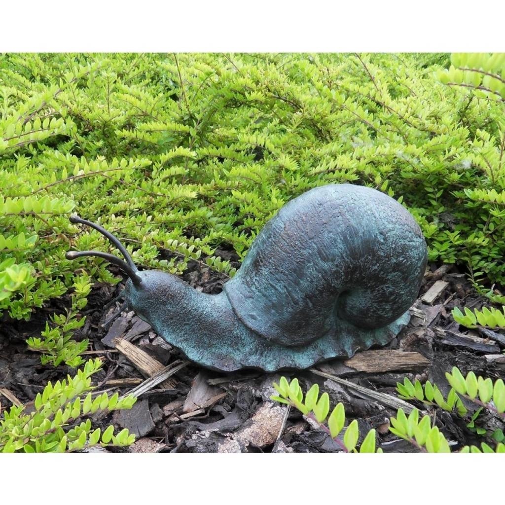 Mooi beeld van een reuzenslak van hoogwaardig brons met een minimale kopergehalte van 75% waardoor een zeer lange levensduur gegarandeerd is.