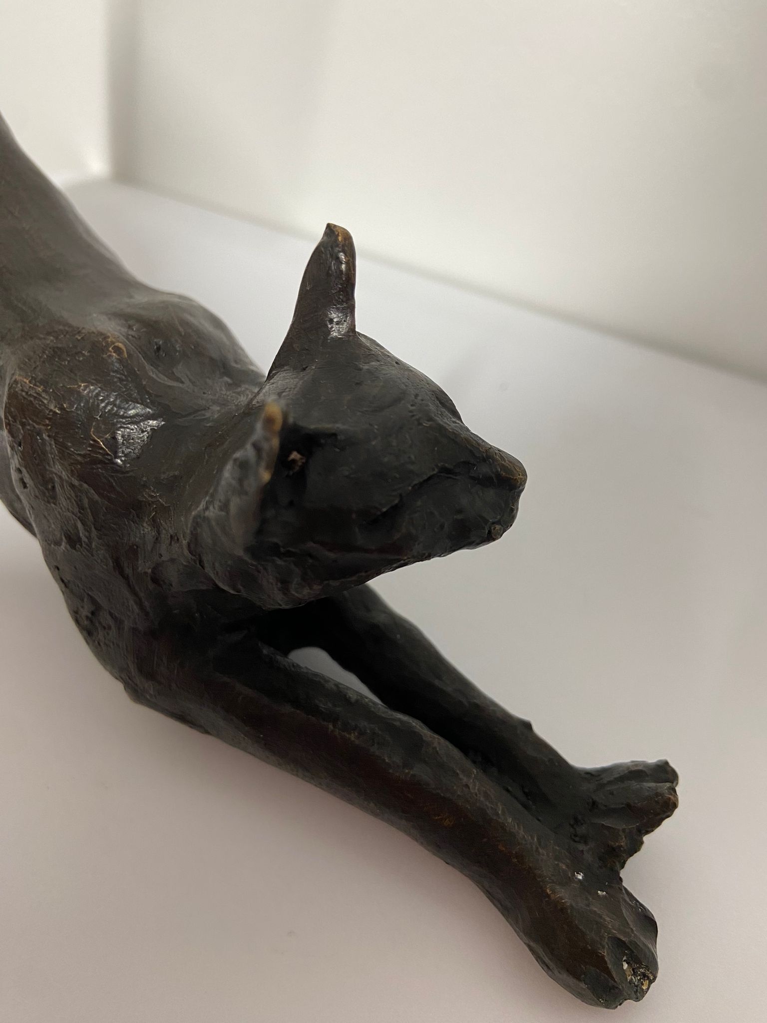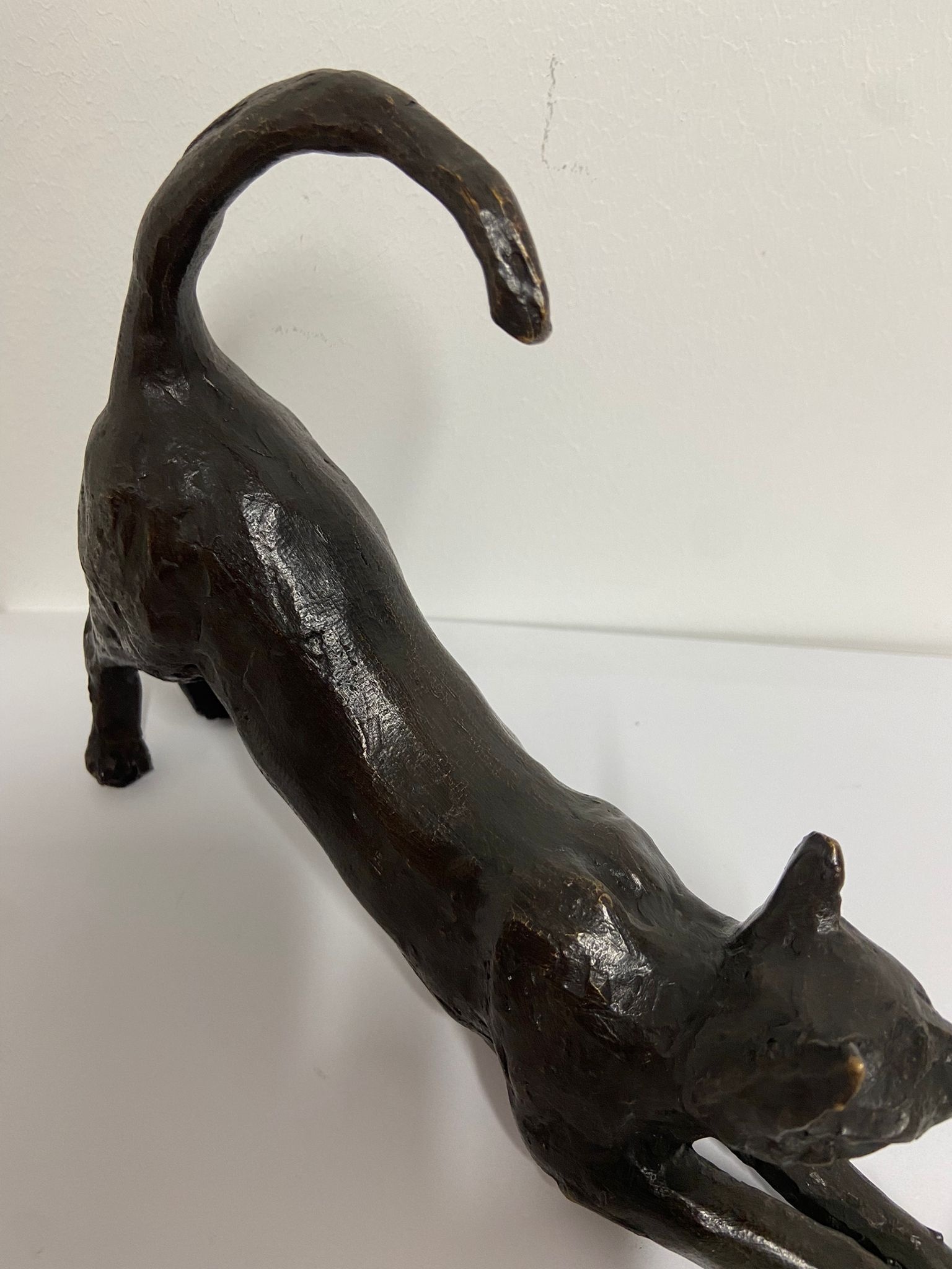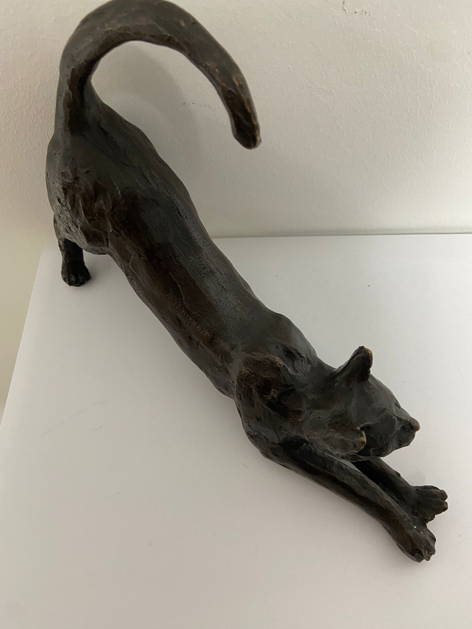 Mooi modern modern vorm gegeven beeld van een uitstrekkende poes in klein formaat. Gemaakt van 100% hoogwaardig brons met een minimale kopergehalte van 75% waardoor een zeer lange levensduur gegarandeerd is en geen lelijke vlekken ontstaan. Een prachtig en duurzaam decoratie object voor huis , bedrijf of tuin, maar ook voor een prachtig geschenk.