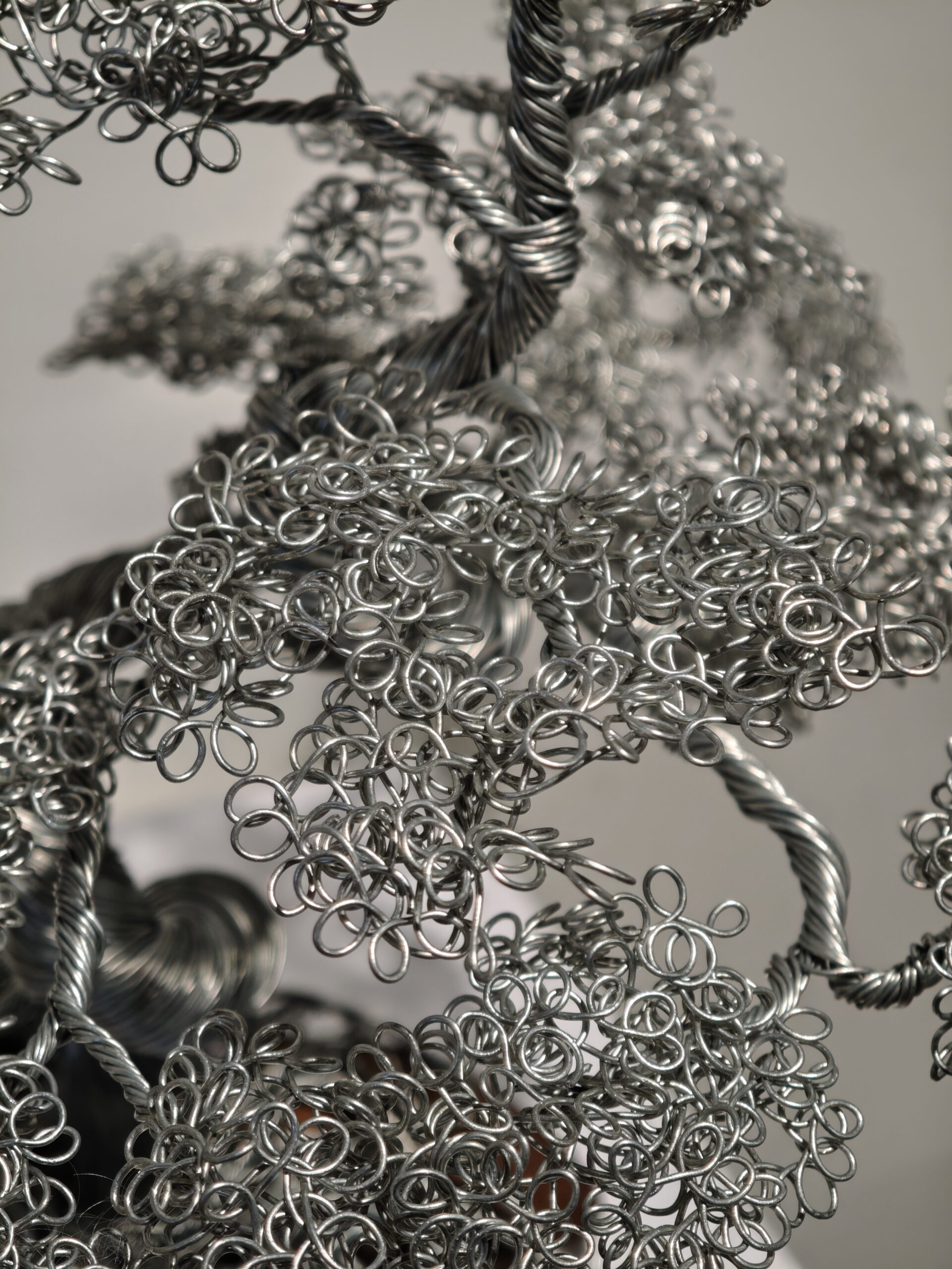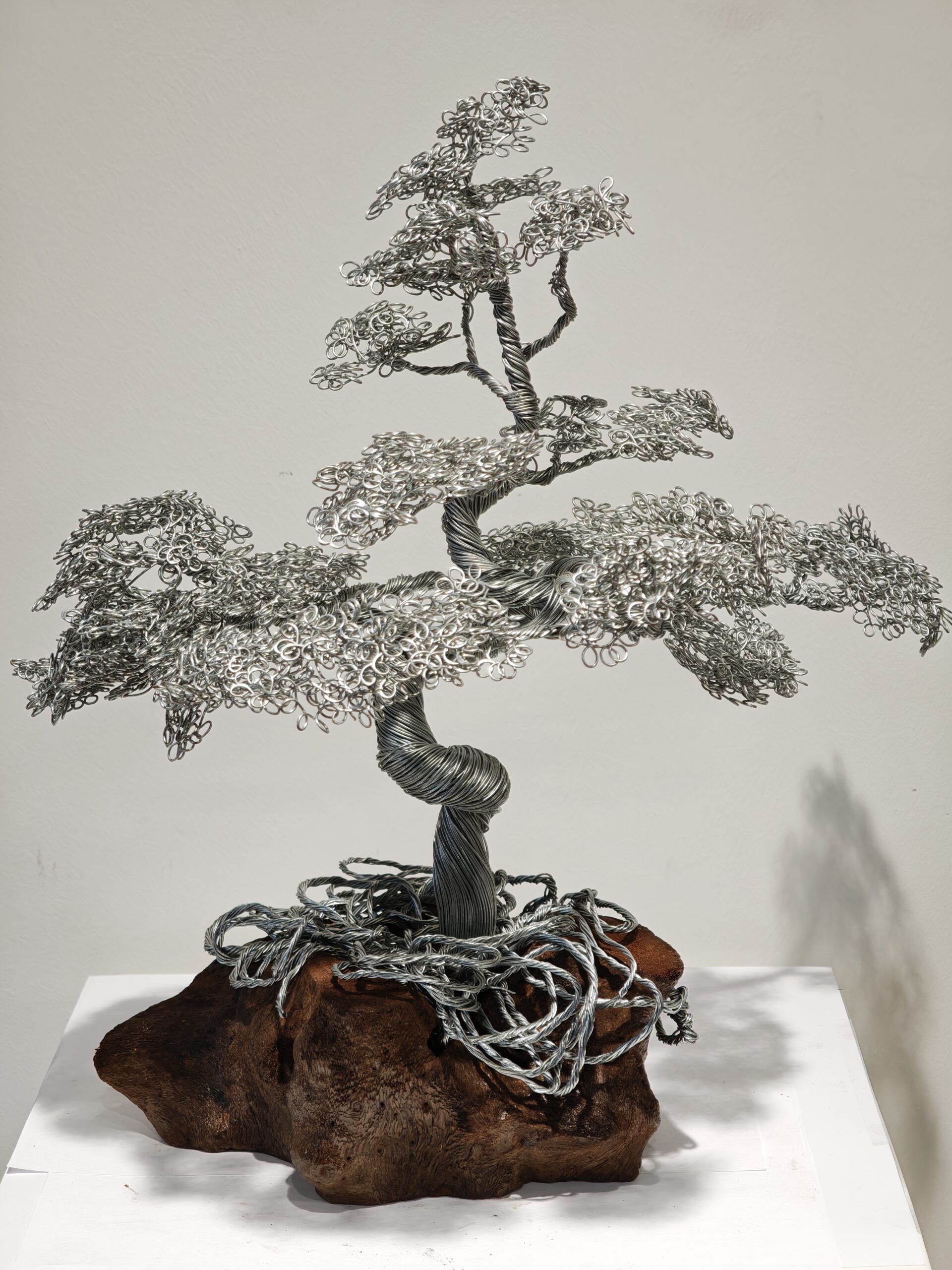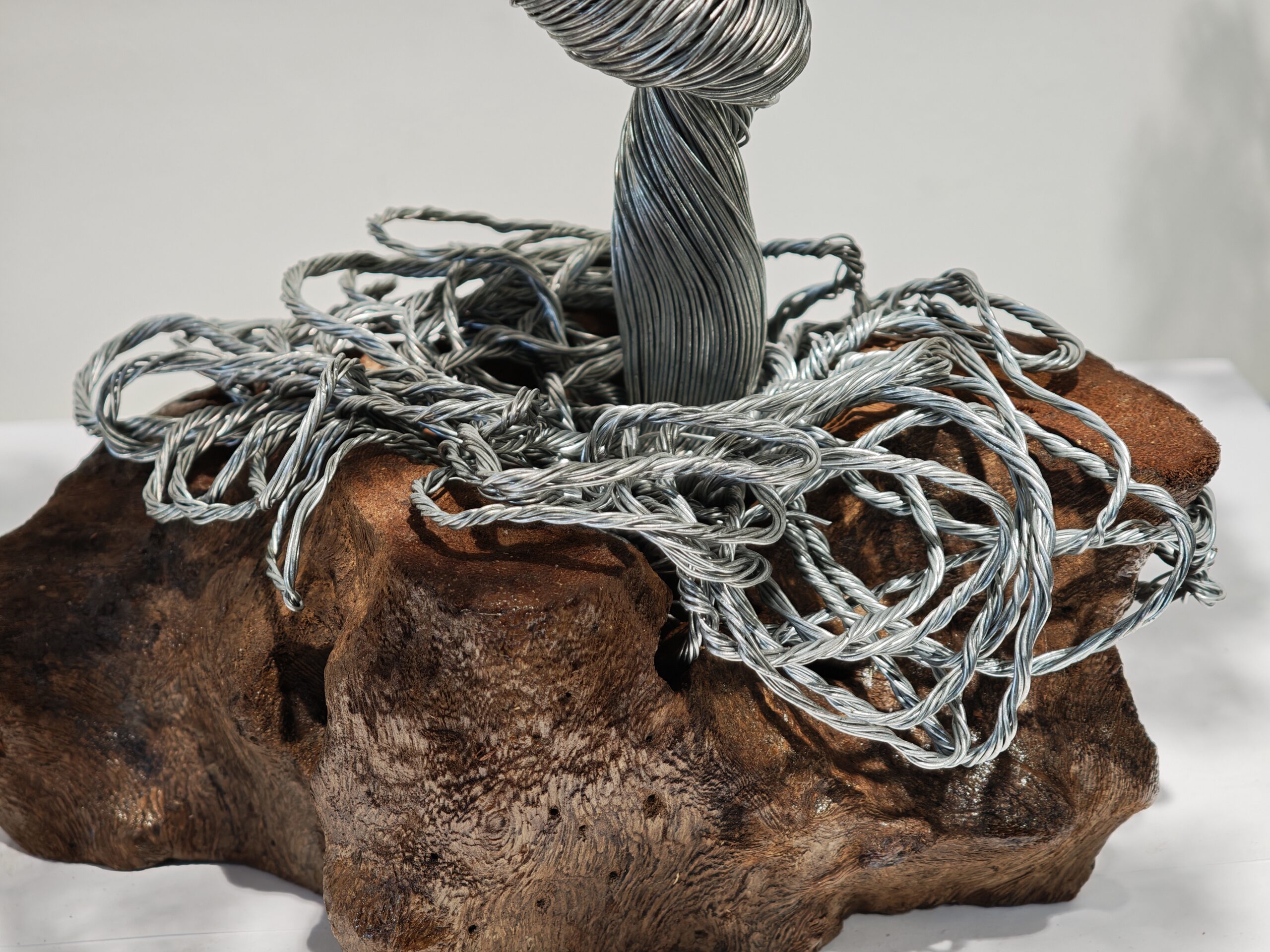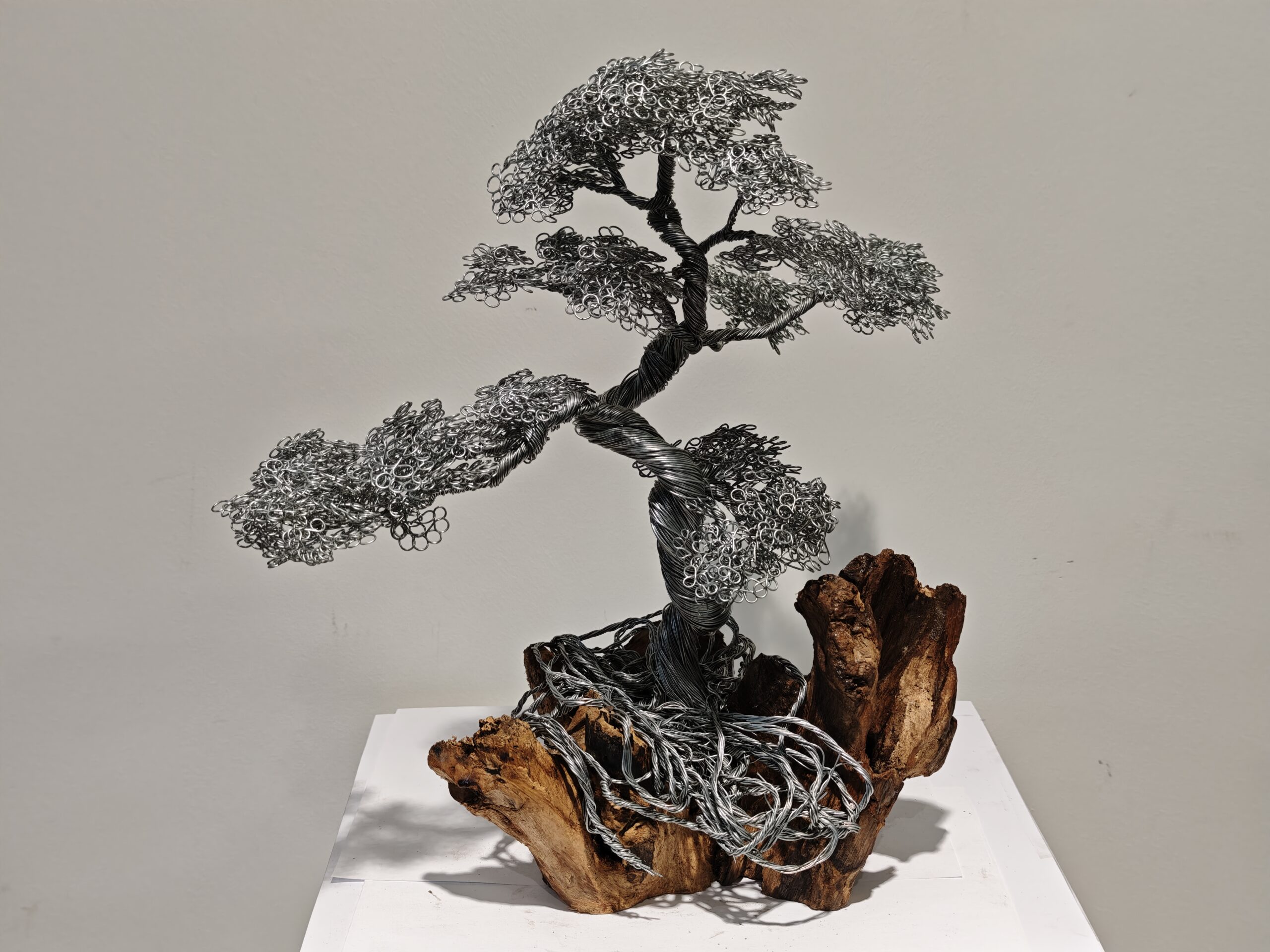 Prachtig stukje vakwerk, deze ijzerdraad boom en een houten boomstronk van massief Suar hout.