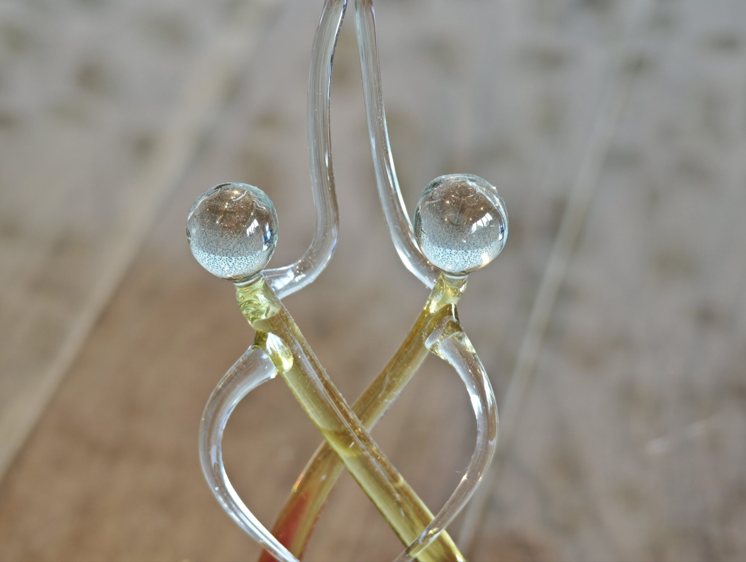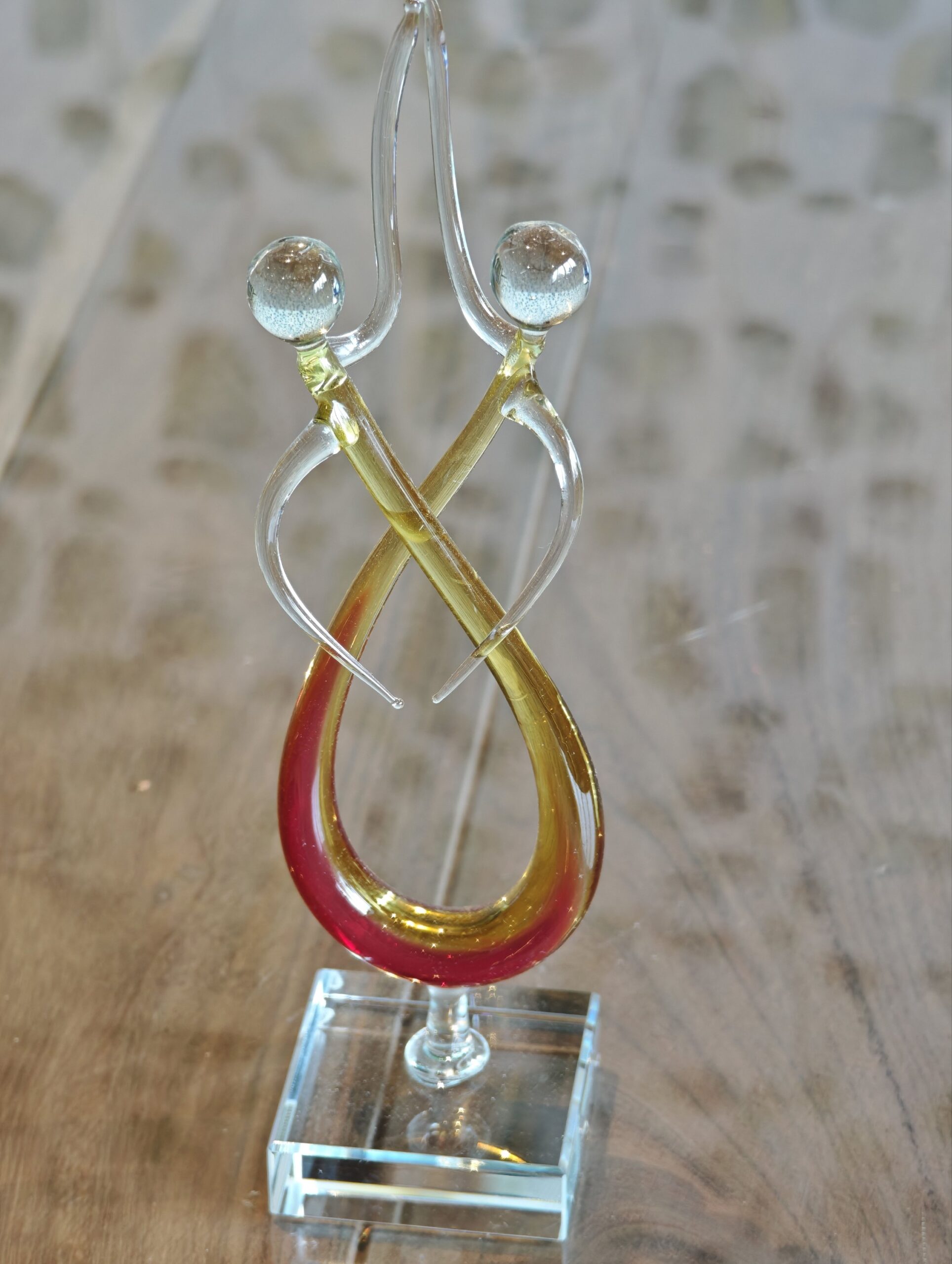 Dit handgemaakte glazen beeld van 22 cm hoog verbeeldt een abstract koppel in een elegante kronkeling met een warme oranje-gele kern. Dankzij het ambachtelijke proces is elk exemplaar een uniek kunstwerk met zijn eigen vormen en kleurnuances, wat zorgt voor een exclusieve blikvanger in jouw interieur.