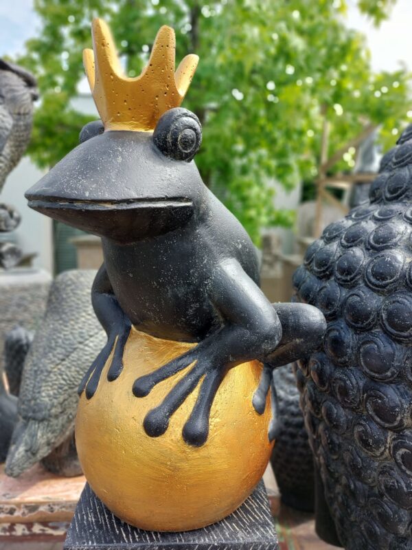 Dit beeld van een koningskikker met kroon op “gouden” bal is gemaakt van hoogwaardig gietsteen met een zeer hoog cement gehalte, waardoor al deze beelden met gemak alle weersinvloeden kunnen weerstaan. De kleur is zwart en kan altijd wat afwijken van de foto omdat heel deze serie handgemaakt is. Beelden van kikkers worden ook vaak kado gedaan aan vrienden, kikkers staan namelijk symbool voor voorspoed, vriendschap en overvloed.