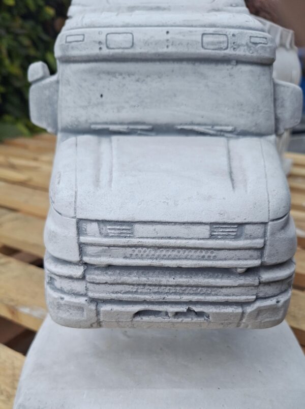 Deze stenen vrachtwagen is een mooi object in elke tuin.
