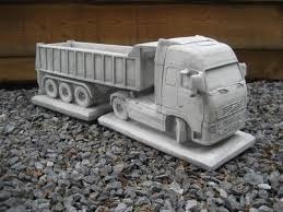 Deze stenen vrachtwagen is een mooi object in elke tuin.