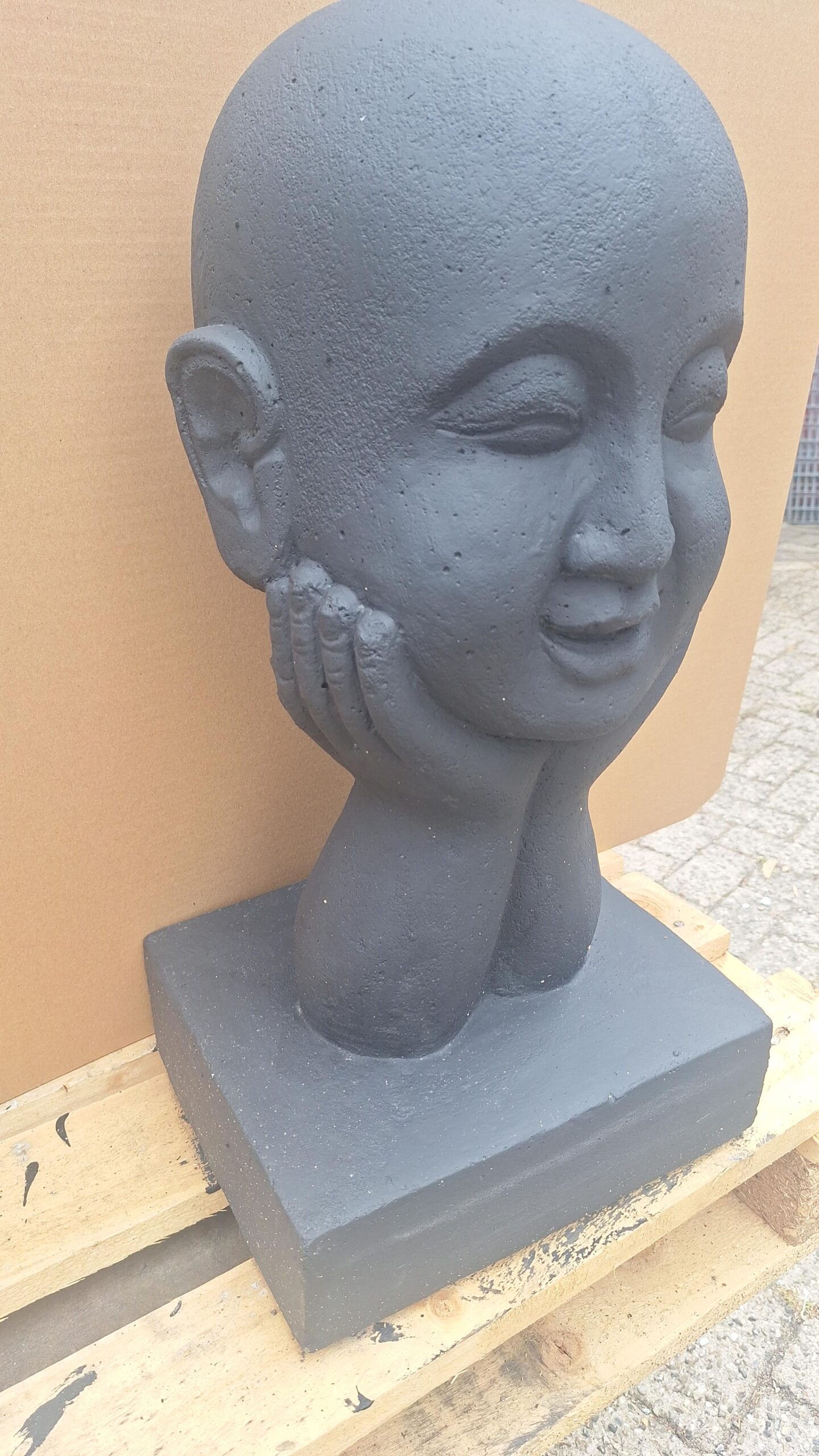 Een prachtig model van een hoofd van een gelukkige Boeddhistische monnik, gedragen op handen, gemaakt van hoogwaardig massief gietsteen in een bruine kleur. Mag binnen en buiten geplaatst worden.