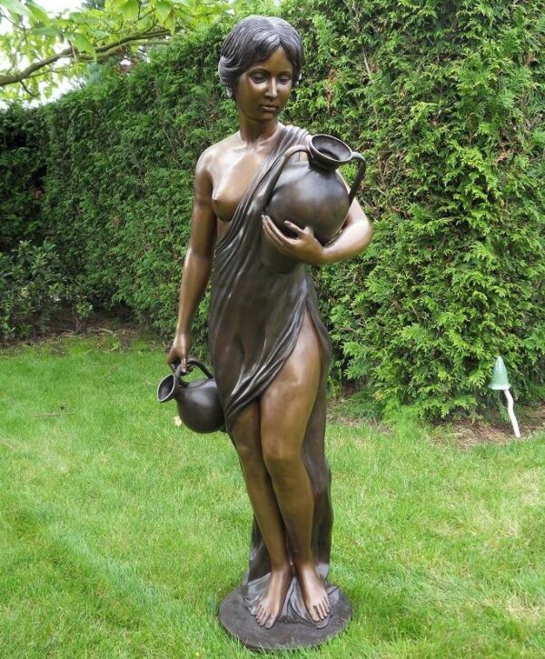 Mooi beeld van Antonia met waterkruiken waar water uitstroomt, van hoogwaardig brons met een minimale kopergehalte van 75% waardoor een zeer lange levensduur gegarandeerd is.