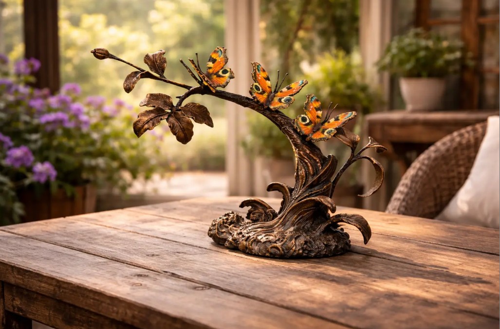 Bronzen beeld drie gekleurde vlinders op tak 31cm
