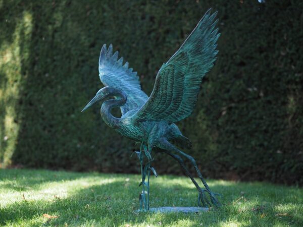 Dit bronzen tijdloze beeld van een vliegende kraanvogel heeft de maat 105x75x83cm en is op ambachtelijke wijze gemaakt met de zogenoemde verlorenwas methode.