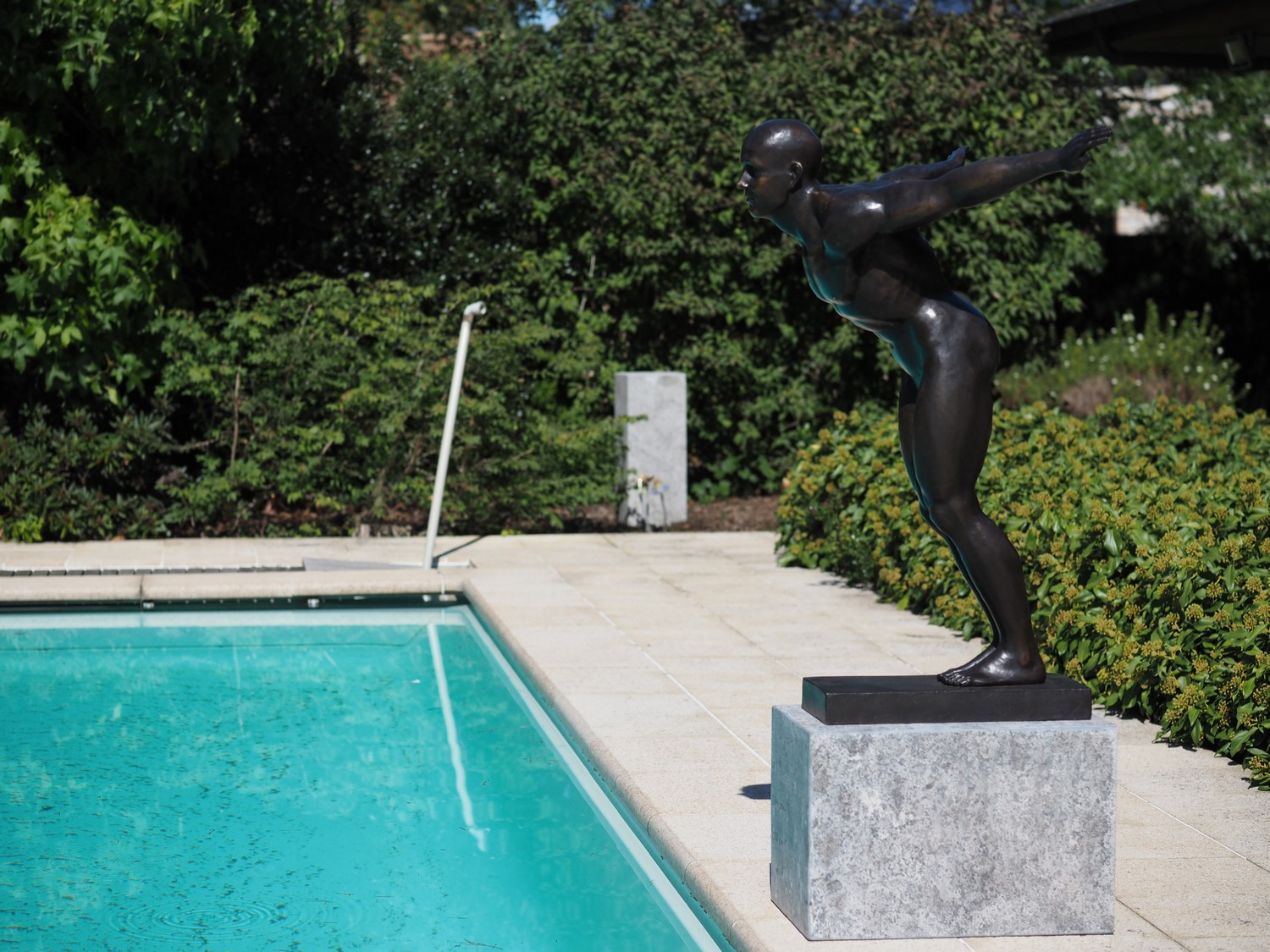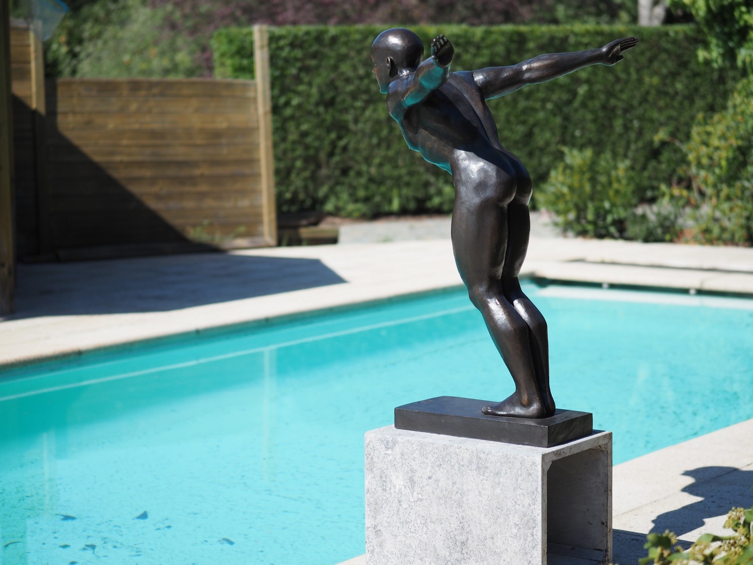 Dit bronzen tijdloze beeld van een zwemmer genaamd david heeft de maat 110x60x115cm en is op ambachtelijke wijze gemaakt met de zogenoemde verlorenwas methode.