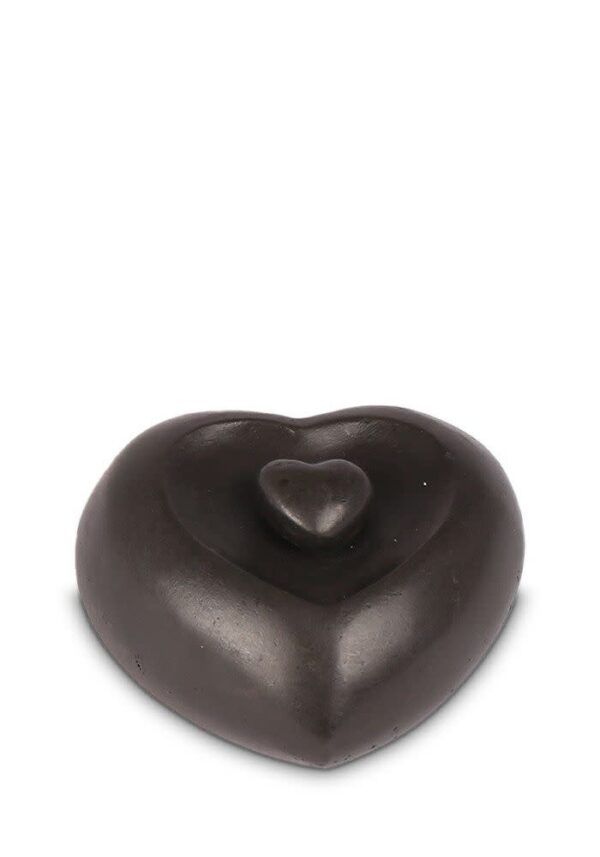 Een prachtig vormgegeven bronzen urn in de vorm van een hartje met een mini hartje bovenop met een as-reservoir waar een gedeelte van het crematie-as bewaard kan blijven. Zo bezit u een mooi gedenkornamentje.