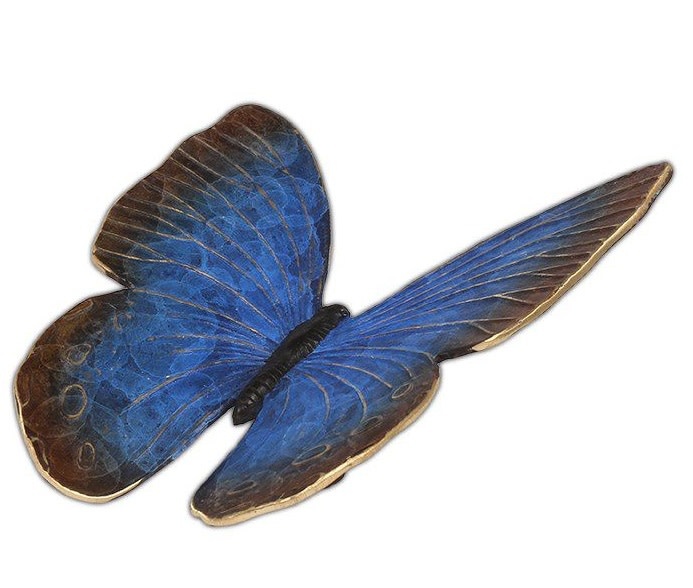 Een prachtig vormgegeven bronzen urn met een blauwe vlinder bovenop met een as-reservoir waar een gedeelte van het crematie-as bewaard kan blijven. Zo bezit u een mooi gedenkornamentje.