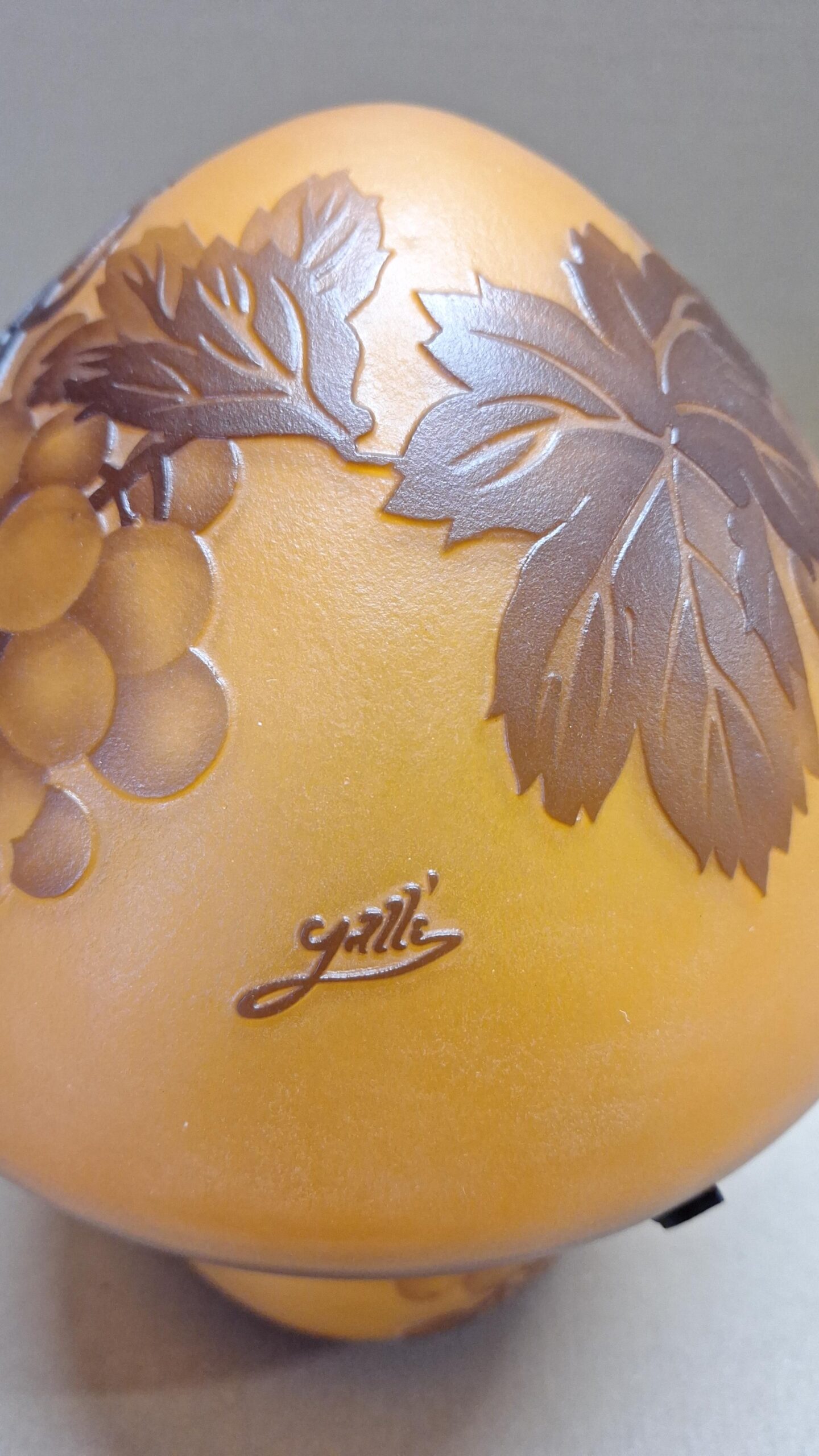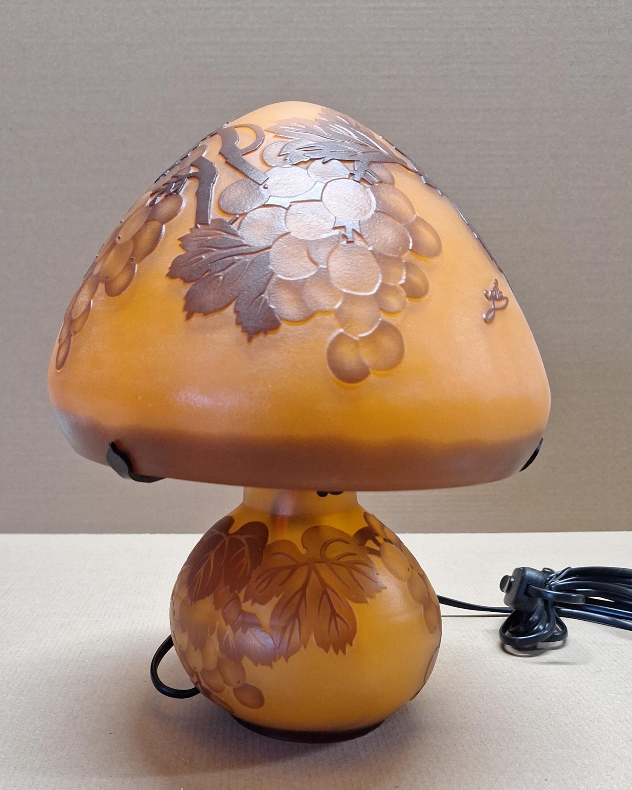 Mooie geel/bruin kleurige lamp met druiven van glas in een sierlijke vorm die gemaakt is volgens de oude Cameo techniek, naar voorbeeld van de wereldberoemde glaskunstenaar Émile Gallé.