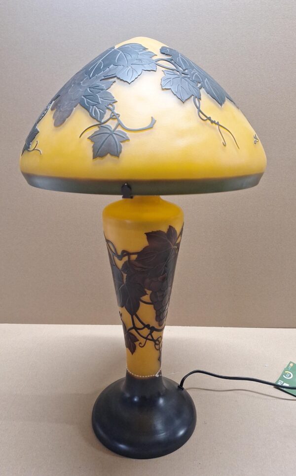 Breng de rijke sfeer van een Franse wijngaard in jouw interieur met deze indrukwekkende Cameo glaslamp ‘Druiventros’. Met een statige hoogte van 60cm en een royale kapdiameter van 36cm is dit model een absolute blikvanger. De lamp is vervaardigd in de stijl van de beroemde Émile Gallé en is rijkelijk versierd met een gedetailleerd decor van druiventrossen en wijnranken, uitgevoerd in warme gele en bruine tinten. Wanneer de verlichting brandt, ontstaat er een prachtige, warme gloed die direct gezelligheid brengt in elke ruimte.