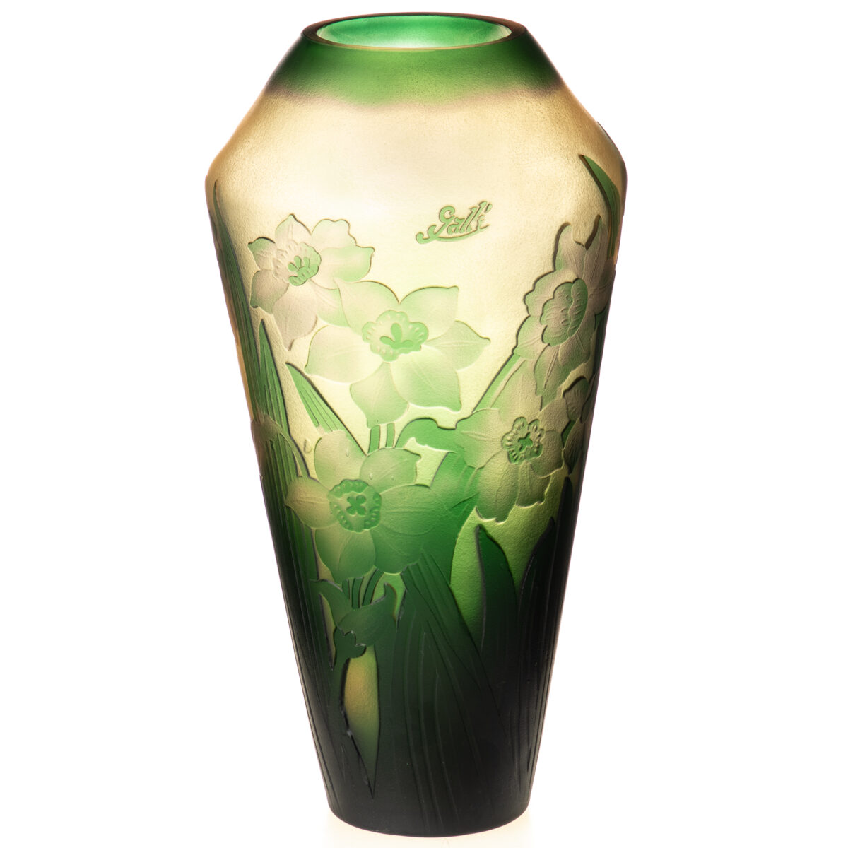 Mooie halfhoge vaas met narcissen van glas in een taps-toe lopende vorm die gemaakt is volgens de oude Cameo techniek, naar voorbeeld van de wereldberoemde glaskunstenaar Émile Gallé.