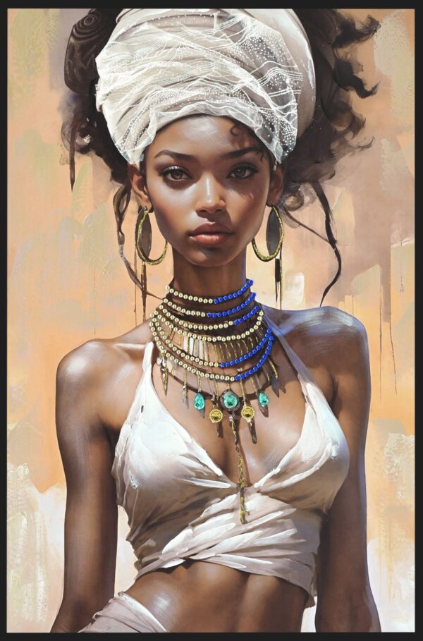 Bent u op zoek naar een hyper modern canvas schilderij met verschillende strass accenten? Dan is dit model matte strass schilderij met een Duku Dame zeker iets voor u. Dit hoge canvas schilderij heeft zeer mooie accenten met steentjes aan haar ketting om haarnek, is zorgvuldig gemaakt met de mooiste kleurcomposities en met veel aandacht voor de finishing touch!
