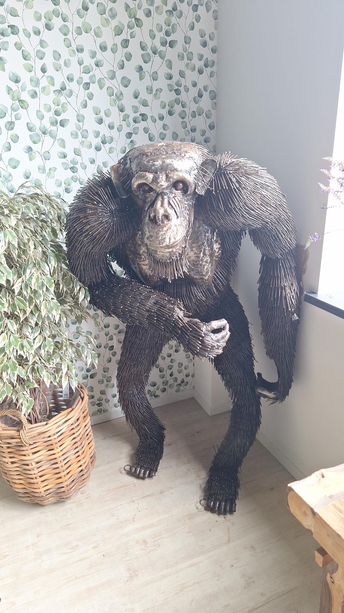 Het zijn echte kunstenaars, die dit beeld van een levensgrote chimpansee gemaakt hebben. Als je dit beeld lang bekijkt ga je beseffen hoeveel werk het is om een kunstwerk als dit te maken. Kloppen, buigen, lassen, meten, het is echt een gigantisch werk. Wilt u iets unieks in uw tuin of bij uw bedrijf, dan bent u er zeker van dat dit model zeer zeldzaam is en niet zomaar te koop is. !!