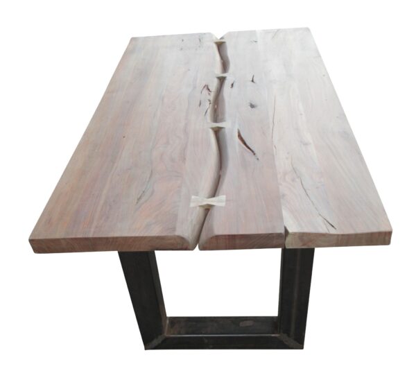 Boomstamtafel Acacia is een robuuste en massieve eettafel met mooie natuurlijke kenmerken en vormen in het tafelblad. De 2 aparte boomstammen zijn met zwaluwstaart verbindingen zeer fraai aan elkaar gemaakt, de 2 delen passen perfect aan elkaar.