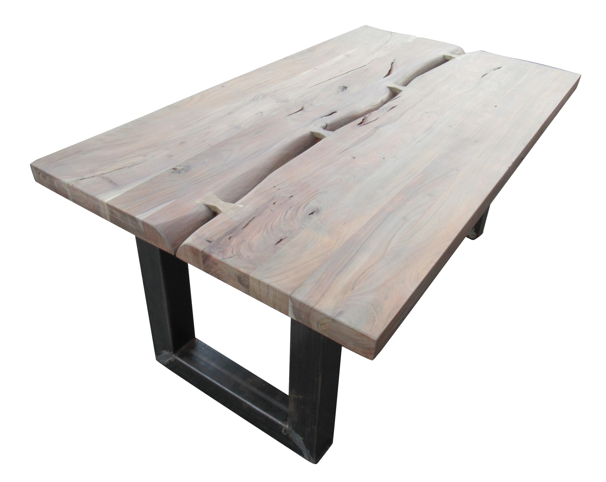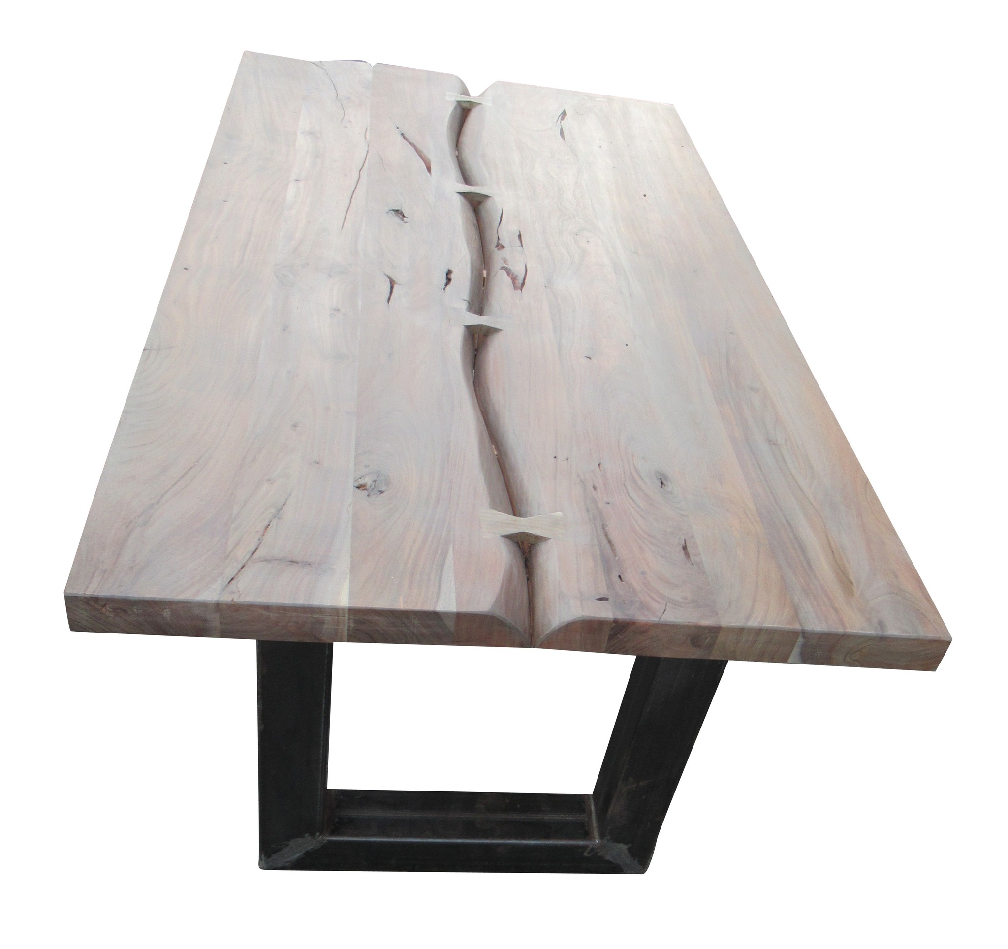 Boomstamtafel Acacia is een robuuste en massieve eettafel met mooie natuurlijke kenmerken en vormen in het tafelblad. De 2 aparte boomstammen zijn met zwaluwstaart verbindingen zeer fraai aan elkaar gemaakt, de 2 delen passen perfect aan elkaar.