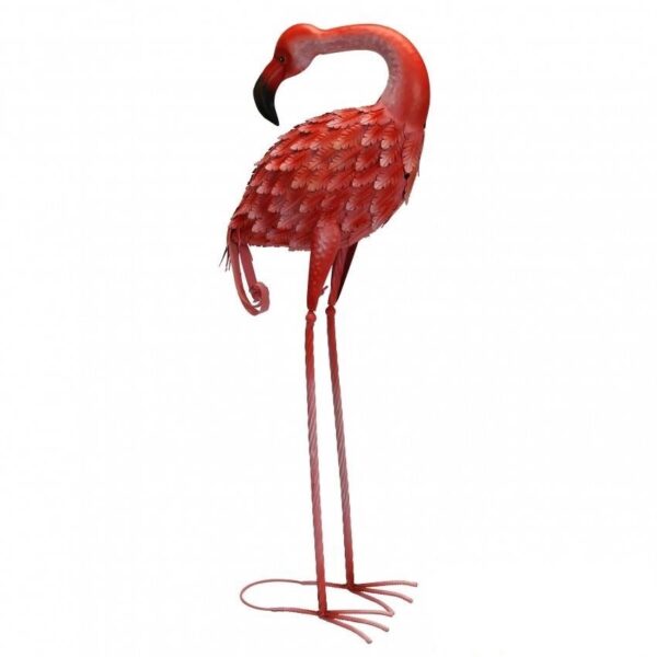 Deze grote achteruit kijkende flamingo, staat decoratief in huis en elke tuin. helemaal met de hand vervaardigd van ijzer.