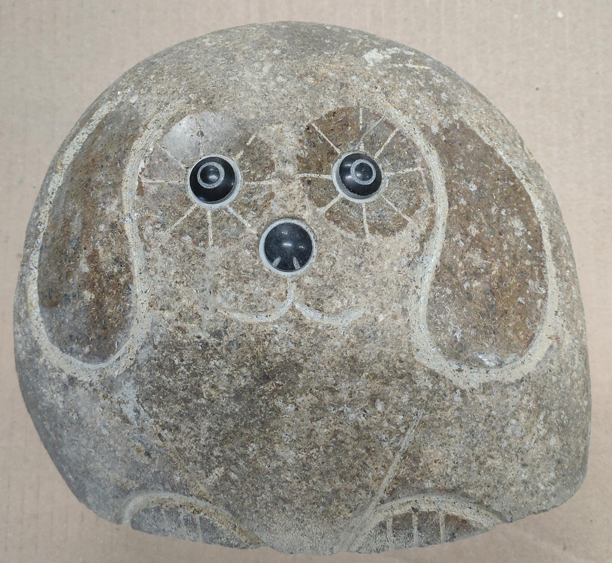 Prachtige stenen beeld van een hond, met de hand gemaakt op een zwerfkei van 15cm. Eerst wordt de afbeelding op de kei getekend, waarna met een beiteltje de lijnen en sommige oppervlakken uitgehakt worden, zodat er diepte verschillen ontstaan. De hoogst liggende delen worden daarna zorgvuldig gepolijst. Een enorme klus, maar het resultaat mag er dan zijn.