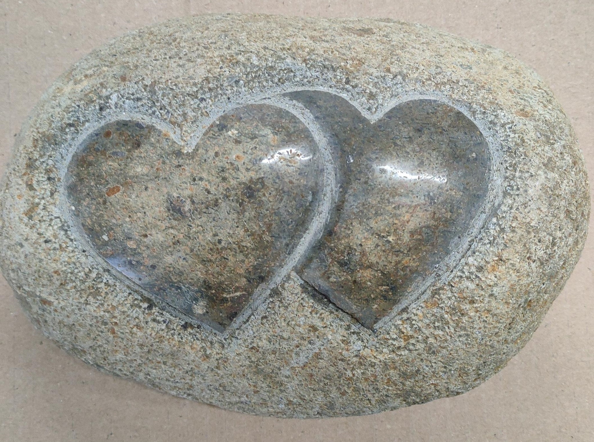 Prachtige kei met 2 harten, met de hand gemaakt op een zwerfkei van 15-18cm. Eerst wordt de afbeelding op de kei getekend, waarna met een beiteltje de lijnen en sommige oppervlakken uitgehakt worden, zodat er diepte verschillen ontstaan. De hoogst liggende delen worden daarna zorgvuldig gepolijst. Een enorme klus, maar het resultaat mag er dan zijn.