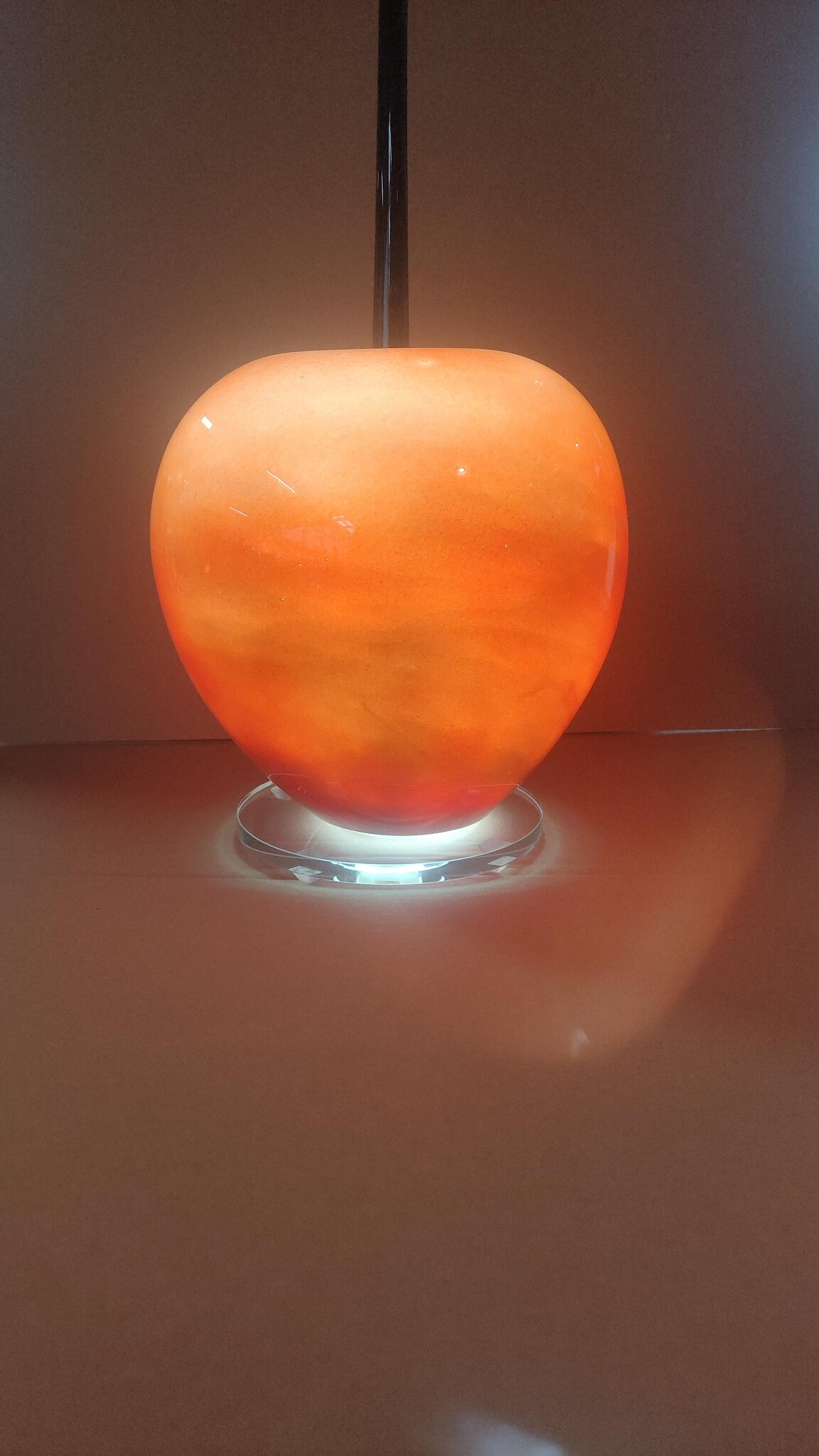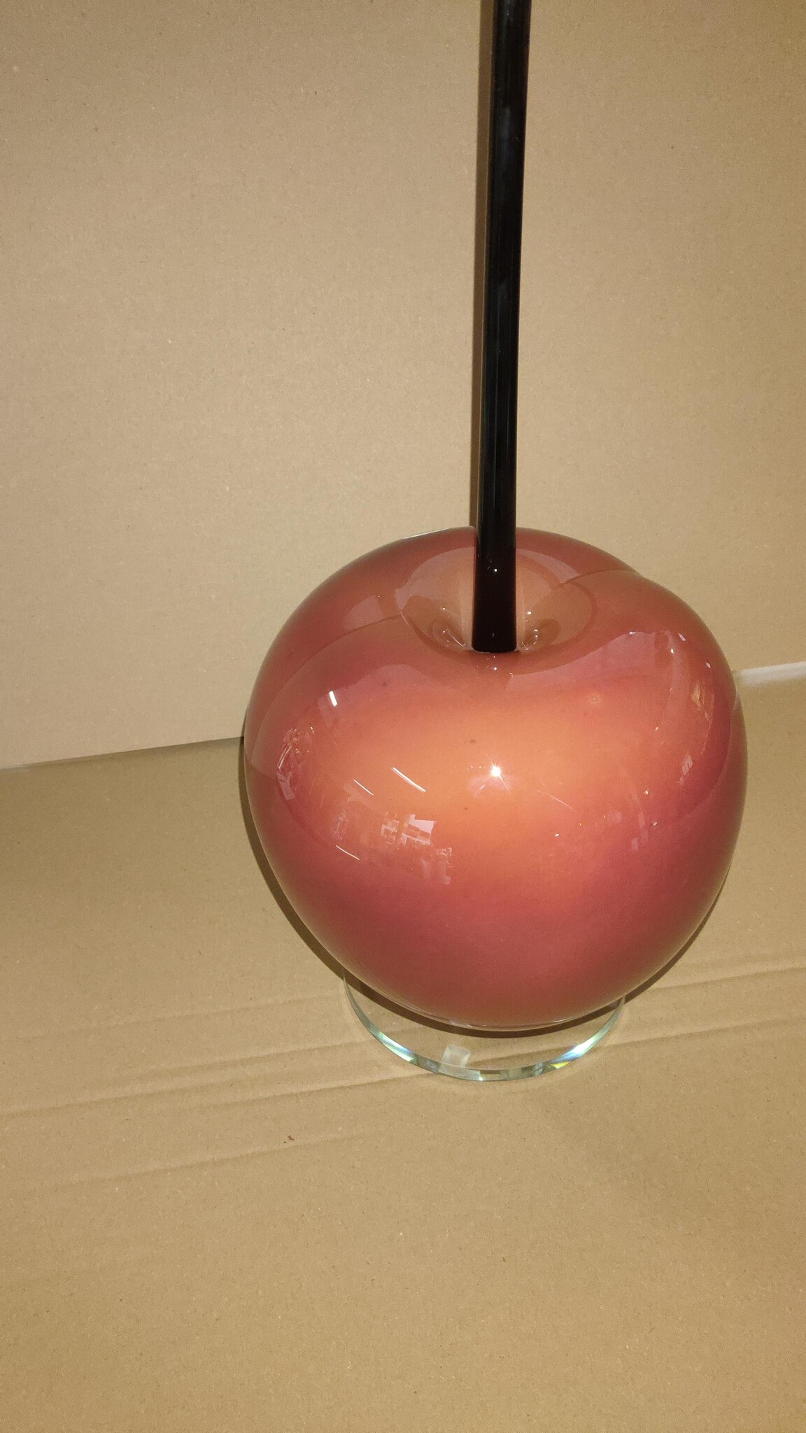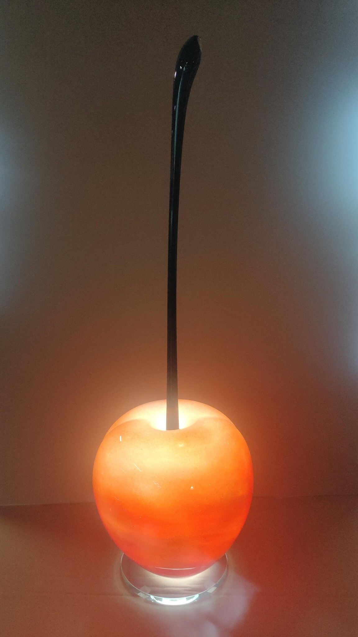 Deze kers gevormde lamp van zeer helder kristalglas is op ouderwetse manier, mond geblazen dus, gemaakt. De gebruikte kleuren in de lamp zijn geweldig mooi en helder, en ademt een zeer warme en vriendelijke sfeer uit.