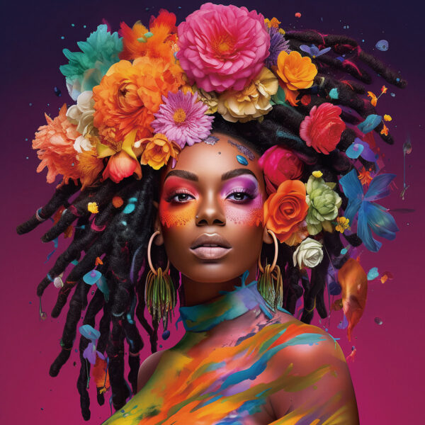 Dit is een vierkante glasplaat met een vrouw met dreadlocks die omringd is met bloemen op een paars / roze achtergrond.