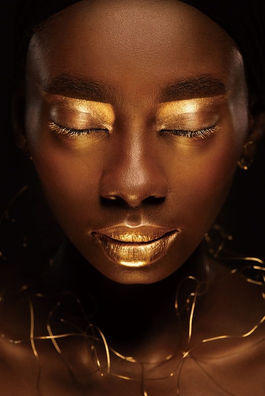 Dit is een grote glasplaat met een donker vrouwengezicht wat prachtig met goud is opgemaakt.