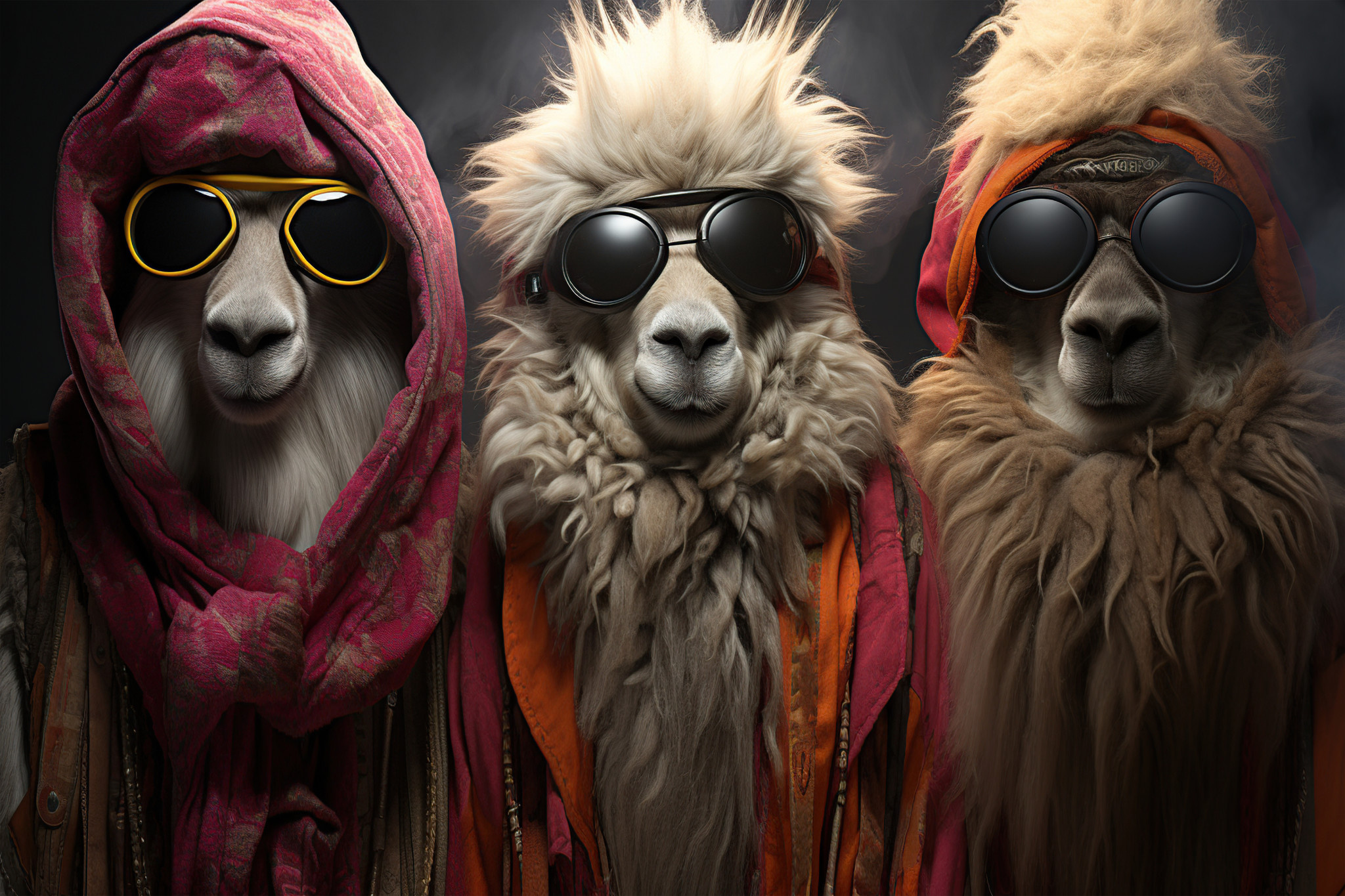 Dit is een brede glasplaat met een drietal aangeklede lama’s in vele kleuren.