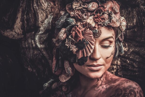 Deze zeer grote glasplaat met een vrouw die theatraal is opgemaakt.